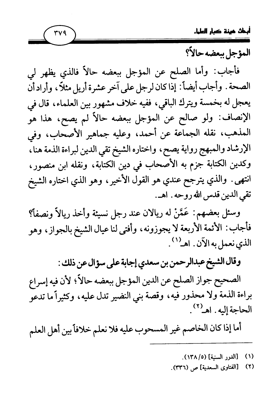 فأجاب: وأما الصلح عن المؤجل ببعضه حالا فالذي يظهر لي الصحة. وأجاب أيضا: إذا كان لرجل على آخر عشرة أريل مثلا، وأراد أن يعجل له بخمسة ويترك الباقي، ففيه خلاف مشهور بين العلماء، قال في الإنصاف: ولو صالح عن المؤجل ببعضه حالا لم يصح، هذا هو المذهب، نقله الجماعة عن أحمد، وعليه جماهير الأصحاب، وفي الإرشاد والمبهج رواية يصح، واختاره الشيخ تقي الدين لبراءة الذمة هنا، وكدين الكتابة جزم به الأصحاب في دين الكتابة، ونقله ابن منصور، انتهى. والذي يترجح عندي هو القول الأخير، وهو الذي اختاره الشيخ تقي الدين قدس الله روحه. اهـ.