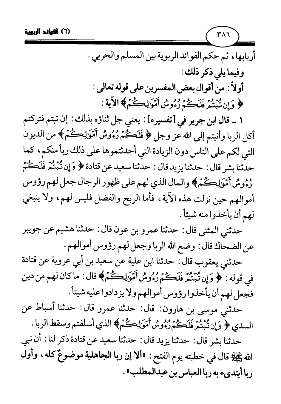 1 - قال ابن جرير في [تفسيره] : يعني جل ثناؤه بذلك: إن تبتم فتركتم أكل الربا وأنبتم إلى الله عز وجل {فَلَكُمْ رُءُوسُ أَمْوَالِكُمْ} (¬2) من الديون التي لكم على الناس دون الزيادة التي أحدثتموها على ذلك ربا منكم، كما حدثنا بشر قال: حدثنا يزيد قال: حدثنا سعيد عن قتادة {وَإِنْ تُبْتُمْ فَلَكُمْ رُءُوسُ أَمْوَالِكُمْ} (¬3) والمال الذي لهم على ظهور الرجال جعل لهم رؤوس أموالهم حين نزلت هذه الآية، فأما الربح والفضل فليس لهم، ولا ينبغي لهم أن يأخذوا منه شيئا.