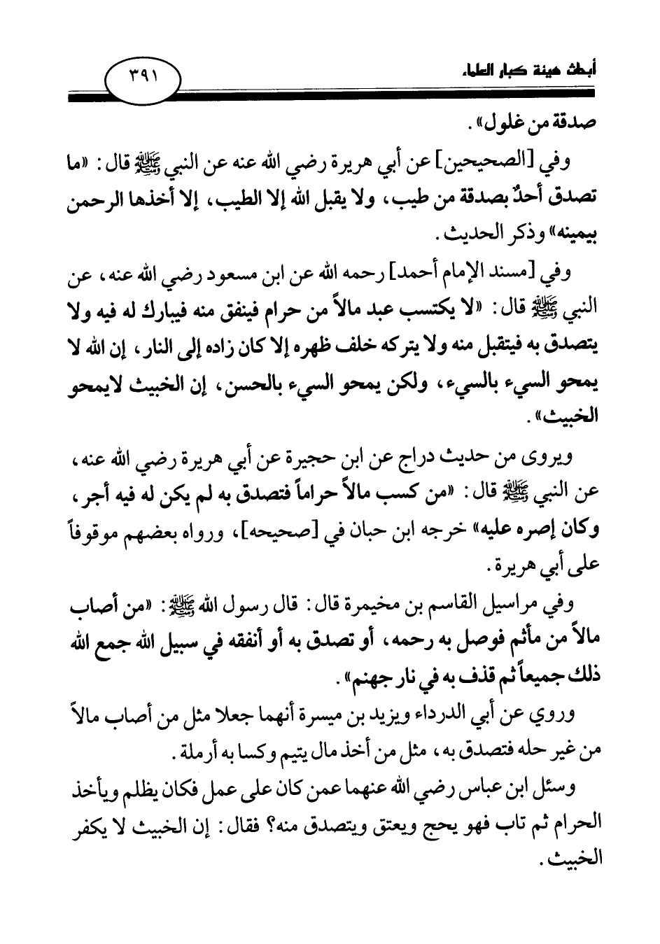 وفي [مسند الإمام أحمد] رحمه الله عن ابن مسعود رضي الله عنه، عن النبي صلى الله عليه وسلم قال: «لا يكتسب عبد مالا من حرام فينفق منه فيبارك له فيه ولا يتصدق به فيتقبل منه ولا يتركه خلف ظهره إلا كان زاده إلى النار، إن الله لا يمحو السيئ بالسيئ، ولكن يمحو السيئ بالحسن، إن الخبيث لا يمحو الخبيث (¬3) » .