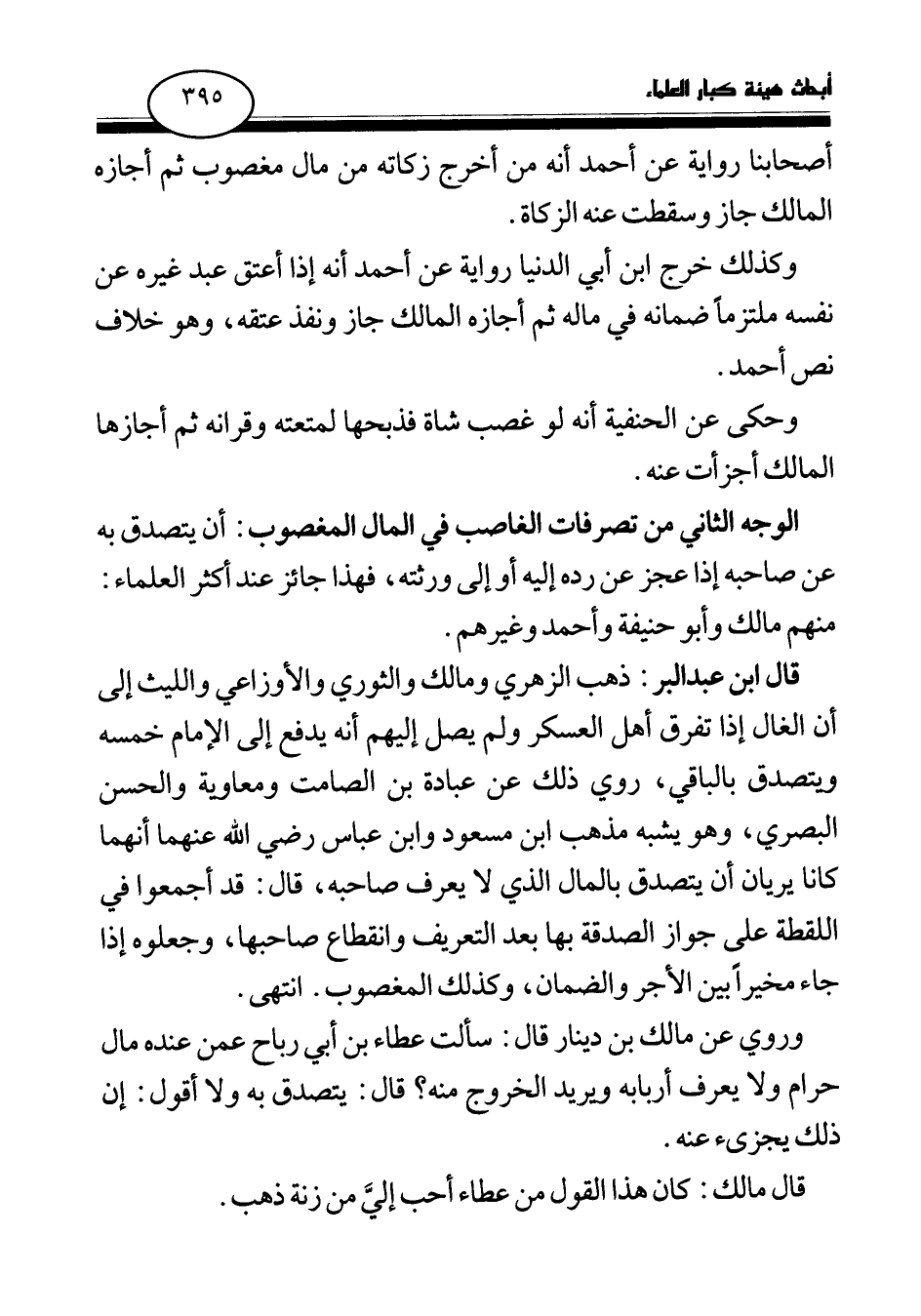 الوجه الثاني من تصرفات الغاصب في المال المغصوب: أن يتصدق به عن صاحبه إذا عجز عن رده إليه أو إلى ورثته، فهذا جائز عند أكثر العلماء: منهم مالك وأبو حنيفة وأحمد وغيرهم.