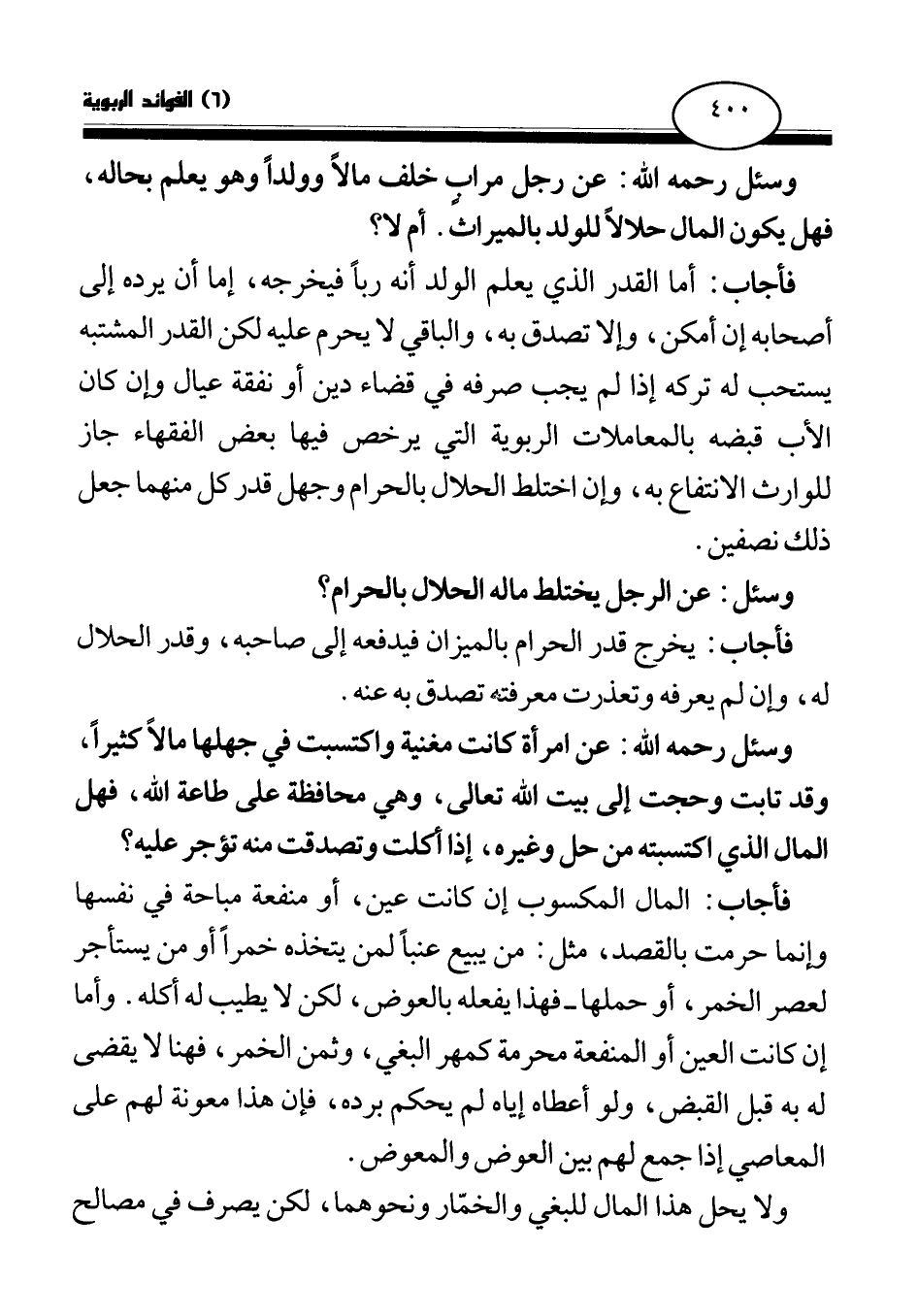 فأجاب: أما القدر الذي يعلم الولد أنه ربا فيخرجه، إما أن يرده إلى أصحابه إن أمكن، وإلا تصدق به، والباقي لا يحرم عليه لكن القدر المشتبه يستحب له تركه إذا لم يجب صرفه في قضاء دين أو نفقة عيال وإن كان الأب قبضه بالمعاملات الربوية التي يرخص فيها بعض الفقهاء جاز للوارث الانتفاع به، وإن اختلط الحلال بالحرام وجهل قدر كل منهما جعل ذلك نصفين.
