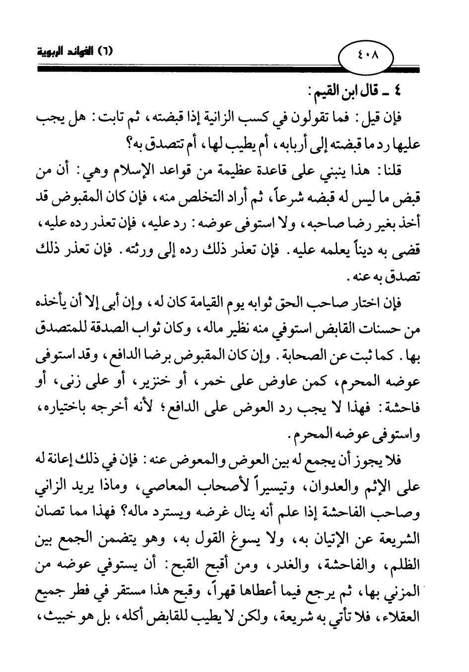 فإن اختار صاحب الحق ثوابه يوم القيامة كان له، وإن أبى إلا أن يأخذه من حسنات القابض استوفي منه نظير ماله، وكان ثواب الصدقة للمتصدق بها. كما ثبت عن الصحابة. وإن كان المقبوض برضا الدافع، وقد استوفى عوضه المحرم، كمن عاوض على خمر، أو خنزير، أو على زنى، أو فاحشة: فهذا لا يجب رد العوض على الدافع؛ لأنه أخرجه باختياره، واستوفى عوضه المحرم.