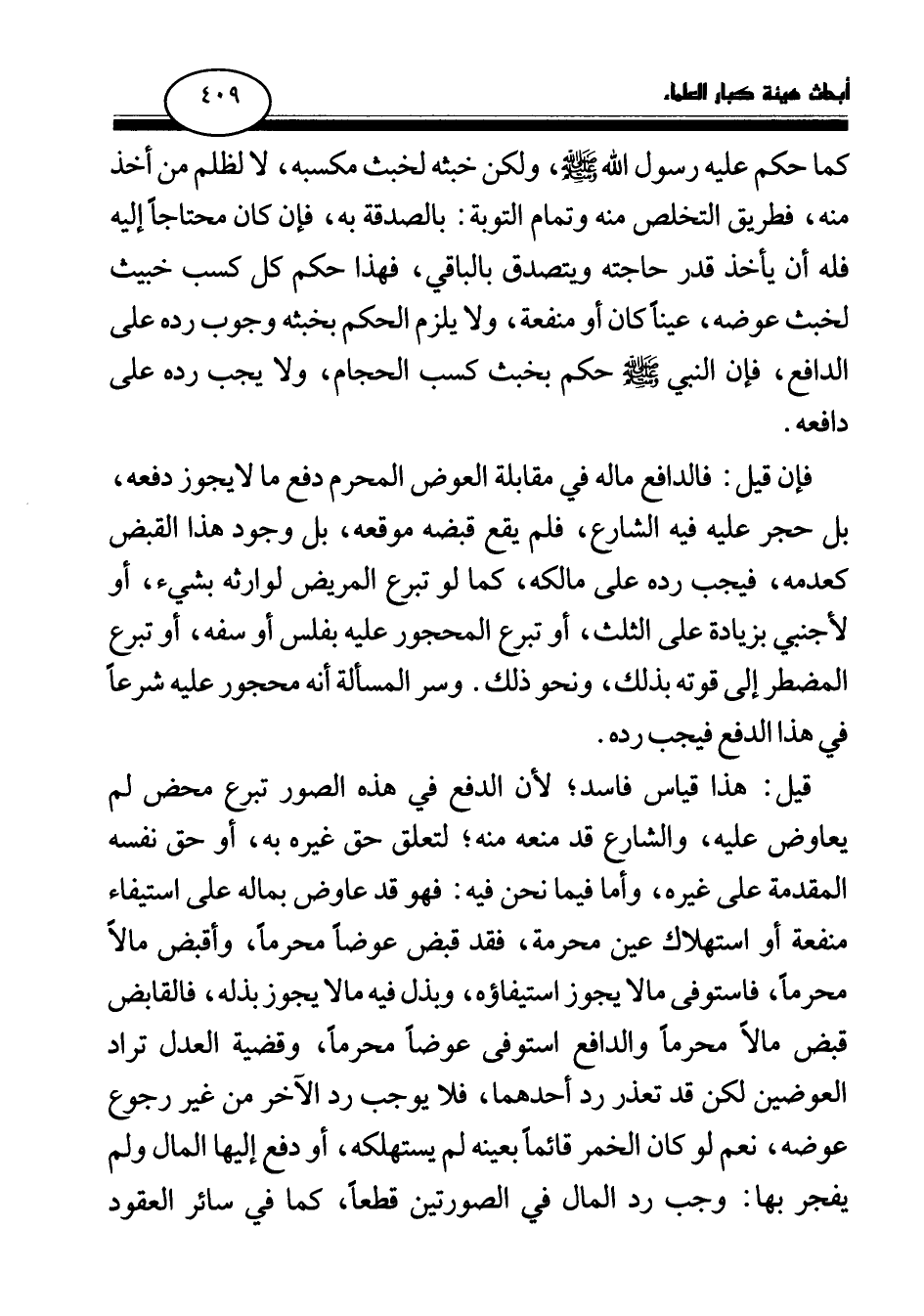 فإن قيل: فالدافع ماله في مقابلة العوض المحرم دفع ما لا يجوز دفعه، بل حجر عليه فيه الشارع، فلم يقع قبضه موقعه، بل وجود هذا القبض كعدمه، فيجب رده على مالكه، كما لو تبرع المريض لوارثه بشيء، أو لأجنبي بزيادة على الثلث، أو تبرع المحجور عليه بفلس أو سفه، أو تبرع المضطر إلى قوته بذلك، ونحو ذلك. وسر المسألة أنه محجور عليه شرعا في هذا الدفع فيجب رده.