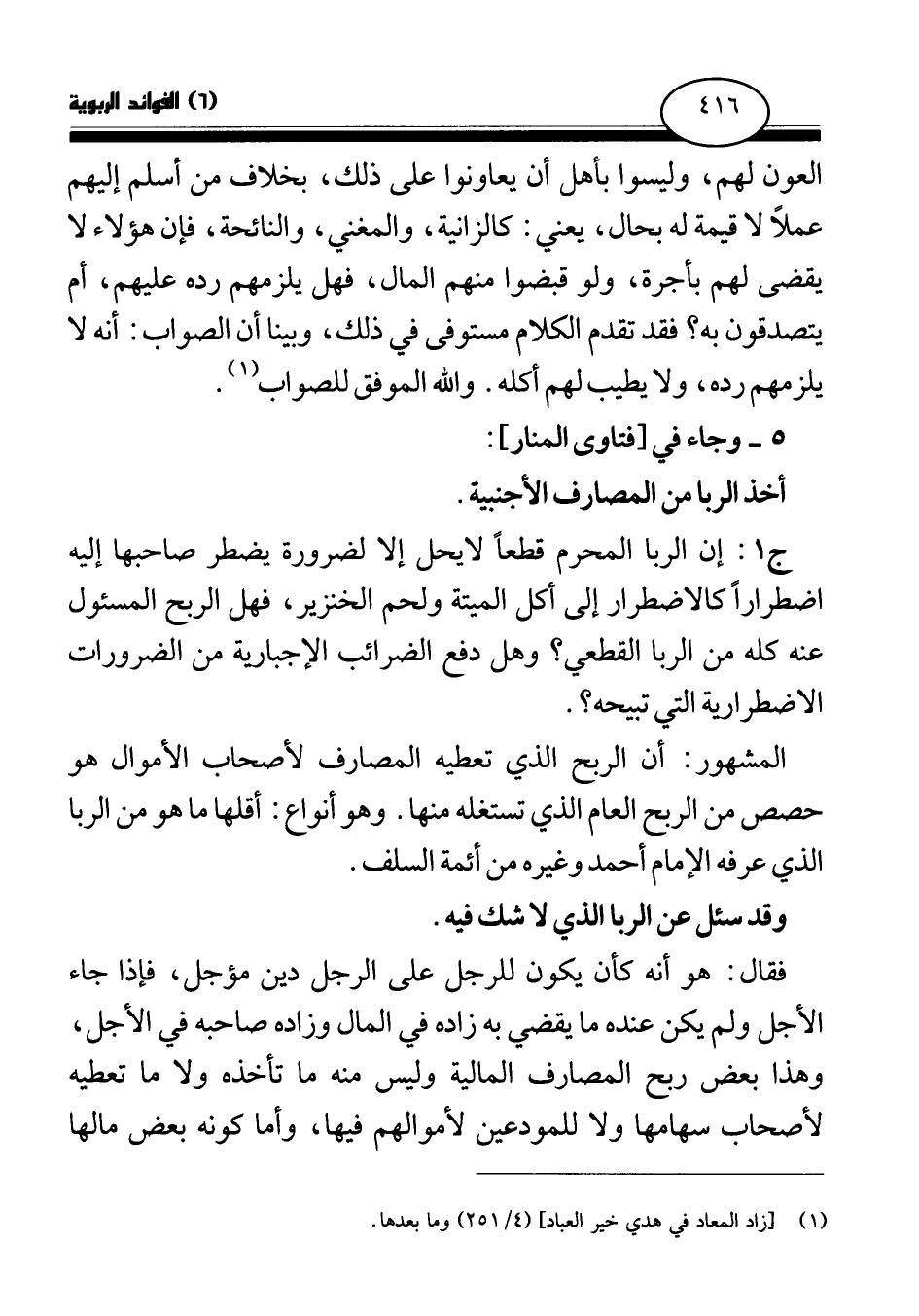 فقال: هو أنه كأن يكون للرجل على الرجل دين مؤجل، فإذا جاء الأجل ولم يكن عنده ما يقضي به زاده في المال وزاده صاحبه في الأجل، وهذا بعض ربح المصارف المالية وليس منه ما تأخذه ولا ما تعطيه لأصحاب سهامها ولا للمودعين لأموالهم فيها، وأما كونه بعض مالها