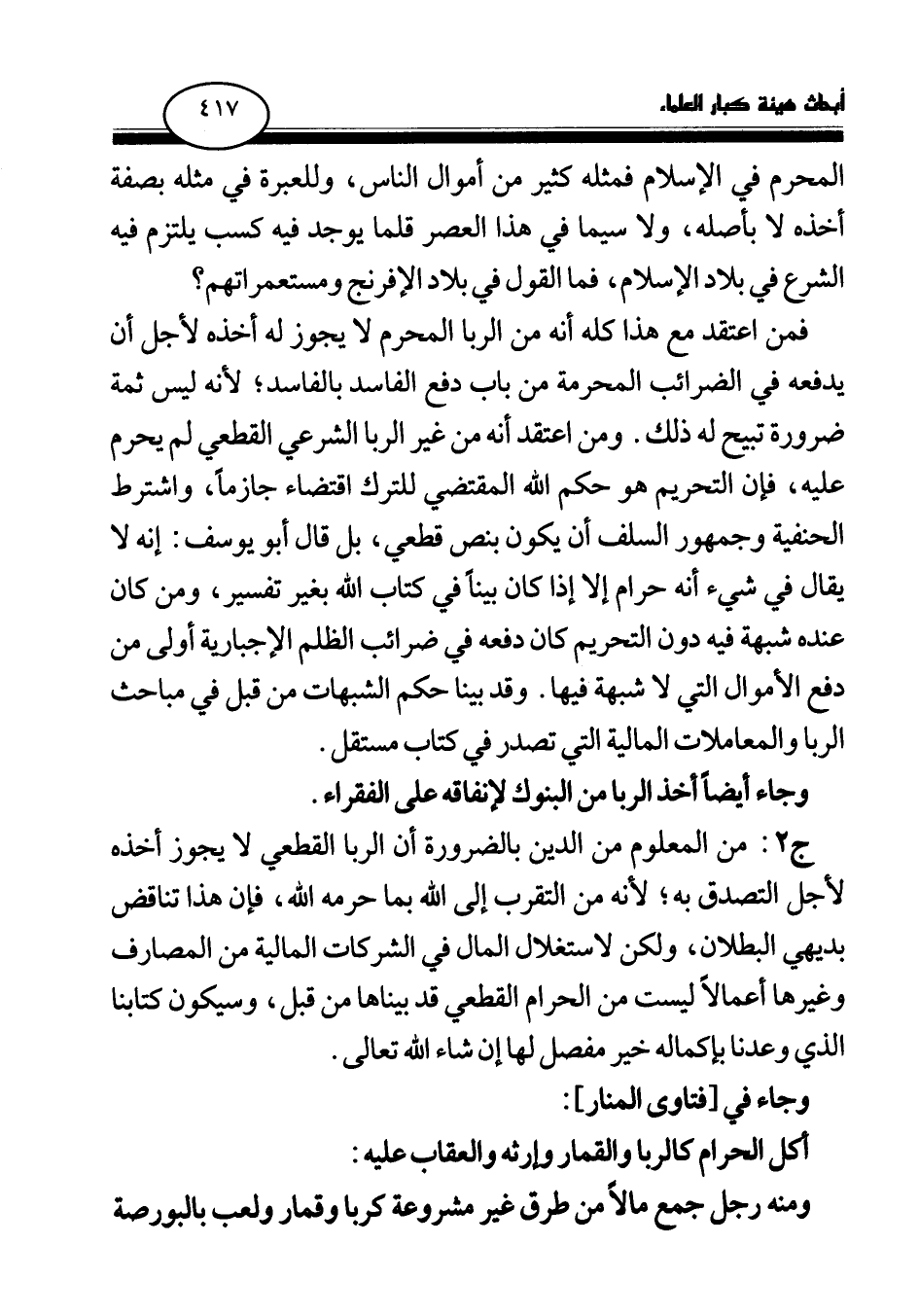 فمن اعتقد مع هذا كله أنه من الربا المحرم لا يجوز له أخذه لأجل أن يدفعه في الضرائب المحرمة من باب دفع الفاسد بالفاسد؛ لأنه ليس ثمة ضرورة تبيح له ذلك. ومن اعتقد أنه من غير الربا الشرعي القطعي لم يحرم عليه، فإن التحريم هو حكم الله المقتضي للترك اقتضاء جازما، واشترط الحنفية وجمهور السلف أن يكون بنص قطعي، بل قال أبو يوسف: إنه لا يقال في شيء أنه حرام إلا إذا كان بينا في كتاب الله بغير تفسير، ومن كان عنده شبهة فيه دون التحريم كان دفعه في ضرائب الظلم الإجبارية أولى من دفع الأموال التي لا شبهة فيها. وقد بينا حكم الشبهات من قبل في مباحث الربا والمعاملات المالية التي تصدر في كتاب مستقل.