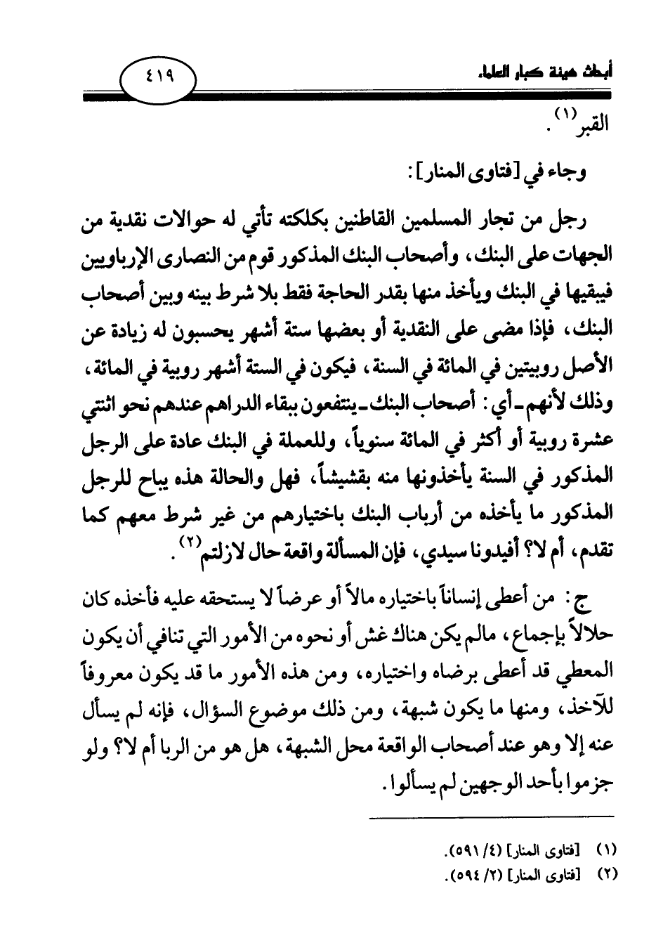 رجل من تجار المسلمين القاطنين بكلكته تأتي له حوالات نقدية من الجهات على البنك، وأصحاب البنك المذكور قوم من النصارى الإرباويين فيبقيها في البنك ويأخذ منها بقدر الحاجة فقط بلا شرط بينه وبين أصحاب البنك، فإذا مضى على النقدية أو بعضها ستة أشهر يحسبون له زيادة عن الأصل روبيتين في المائة في السنة، فيكون في الستة أشهر روبية في المائة، وذلك لأنهم- أي: أصحاب البنك- ينتفعون ببقاء الدراهم عندهم نحو اثنتي عشرة روبية أو أكثر في المائة سنويا، وللعملة في البنك عادة على الرجل المذكور في السنة يأخذونها منه بقشيشا، فهل والحالة هذه يباح للرجل المذكور ما يأخذه من أرباب البنك باختيارهم من غير شرط معهم كما تقدم، أم لا؟ أفيدونا سيدي، فإن المسألة واقعة حال لازلتم (¬2)