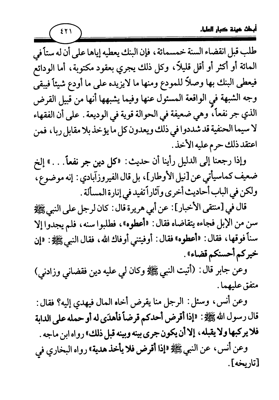 طلب قبل انقضاء السنة خمسمائة، فإن البنك يعطيه إياها على أن له ستا في المائة أو أكثر أو أقل قليلا، وكل ذلك يجري بعقود مكتوبة، أما الودائع فيعطى البنك بها وصلا للمودع ومنها ما لا يزيده على ما أودع شيئا فيبقى وجه الشبهة في الواقعة المسئول عنها وفيما يشبهها أنها من قبيل القرض الذي جر نفعا، وهي ضعيفة في الحوالة قوية في الوديعة. على أن الفقهاء لا سيما الحنفية قد شددوا في ذلك ويعدون كل ما يؤخذ بلا مقابل ربا، فمن اعتقد ذلك حرم عليه الأخذ.