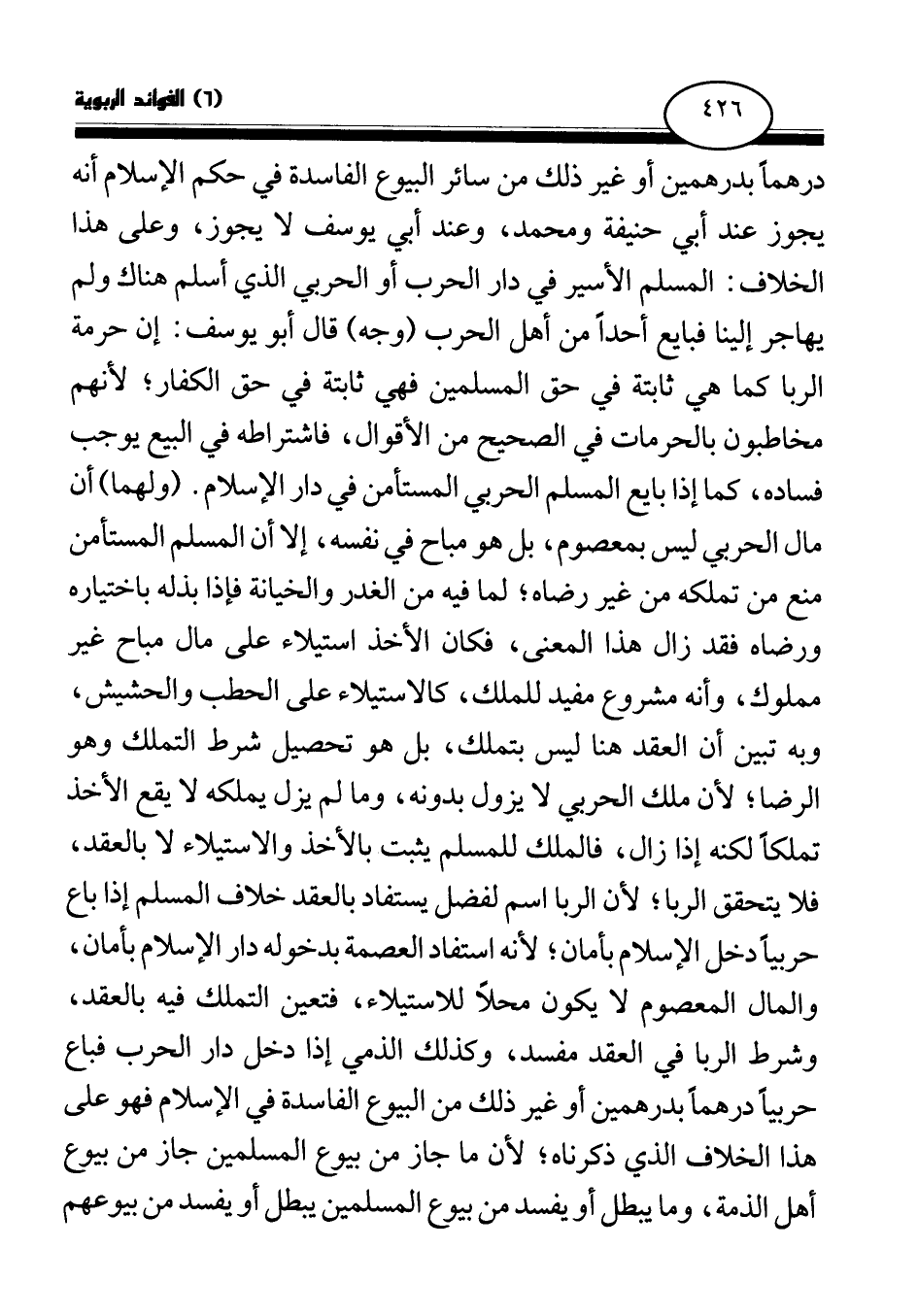 درهما بدرهمين أو غير ذلك هن سائر البيوع الفاسدة في حكم الإسلام أنه يجوز عند أبي حنيفة ومحمد، وعند أبي يوسف لا يجوز، وعلى هذا الخلاف: المسلم الأسير في دار الحرب أو الحربي الذي أسلم هناك ولم يهاجر إلينا فبايع أحدا من أهل الحرب (وجه) قال أبو يوسف: إن حرمة الربا كما هي ثابتة في حق المسلمين فهي ثابتة في حق الكفار؛ لأنهم مخاطبون بالحرمات في الصحيح من الأقوال، فاشتراطه في البيع يوجب فساده، كما إذا بايع المسلم الحربي المستأمن في دار الإسلام. (ولهما) أن مال الحربي ليس بمعصوم، بل هو مباح في نفسه، إلا أن المسلم المستأمن منع من تملكه من غير رضاه؛ لما فيه من الغدر والخيانة فإذا بذله باختياره ورضاه فقد زال هذا المعنى، فكان الأخذ استيلاء على مال مباح غير مملوك، وأنه مشروع مفيد للملك، كالاستيلاء على الحطب والحشيش، وبه تبين أن العقد هنا ليس بتملك، بل هو تحصيل شرط التملك وهو الرضا؛ لأن ملك الحربي لا يزول بدونه، وما لم يزل يملكه لا يقع الأخذ تملكا لكنه إذا زال، فالملك للمسلم يثبت بالأخذ والاستيلاء لا بالعقد، فلا يتحقق الربا؛ لأن الربا اسم لفضل يستفاد بالعقد خلاف المسلم إذا باع حربيا دخل الإسلام بأمان؛ لأنه استفاد العصمة بدخوله دار الإسلام بأمان، والمال المعصوم لا يكون محلا للاستيلاء، فتعين التملك فيه بالعقد، وشرط الربا في العقد مفسد، وكذلك الذمي إذا دخل دار الحرب فباع حربيا درهما بدرهمين أو غير ذلك من البيوع الفاسدة في الإسلام فهو على هذا الخلاف الذي ذكرناه؛ لأن ما جاز من بيوع المسلمين جاز من بيوع أهل الذمة، وما يبطل أو يفسد من بيوع المسلمين يبطل أو يفسد من بيوعهم