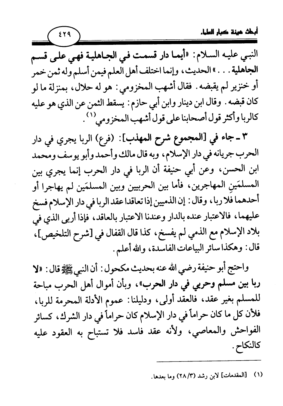 3 - جاء في [المجموع شرح المهذب] : (فرع) الربا يجري في دار الحرب جريانه في دار الإسلام، وبه قال مالك وأحمد وأبو يوسف ومحمد بن الحسن، وعن أبي حنيفة أن الربا في دار الحرب إنما يجري بين المسلمين المهاجرين، فأما بين الحربيين وبين المسلمين لم يهاجرا أو أحدهما فلا ربا، وقال: إن الذميين إذا تعاقدا عقد الربا في دار الإسلام فسخ عليهما، فالاعتبار عنده بالدار وعندنا الاعتبار بالعاقد، فإذا أربى الذي في بلاد الإسلام مع الذمي لم يفسخ، كذا قال القفال في [شرح التلخيص] ، قال: وهكذا سائر البياعات الفاسدة، والله أعلم.