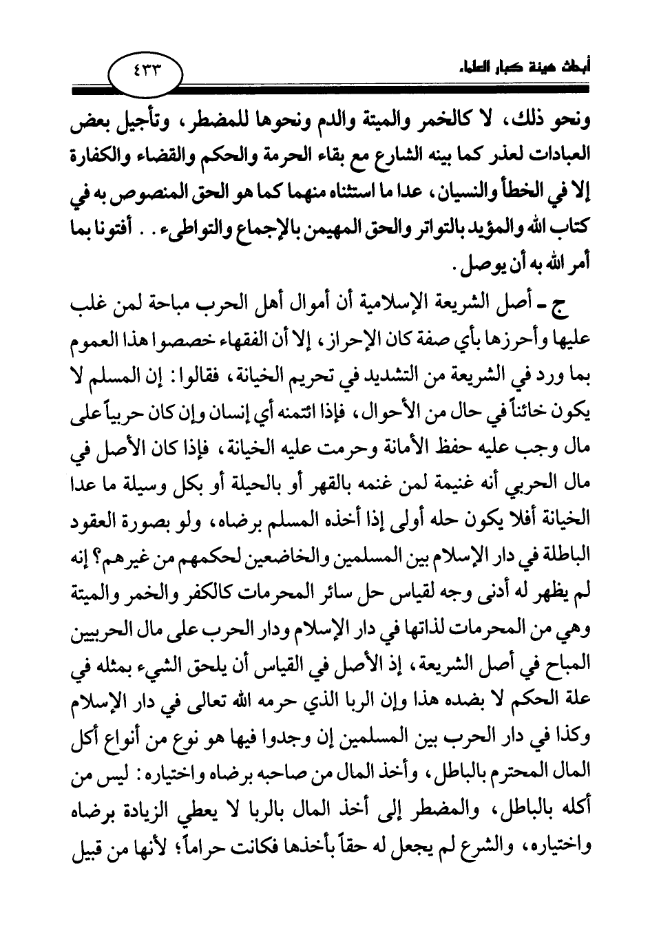ج- أصل الشريعة الإسلامية أن أموال أهل الحرب مباحة لمن غلب عليها وأحرزها بأي صفة كان الإحراز، إلا أن الفقهاء خصصوا هذا العموم بما ورد في الشريعة من التشديد في تحريم الخيانة، فقالوا: إن المسلم لا يكون خائنا في حال من الأحوال، فإذا ائتمنه أي إنسان وإن كان حربيا على مال وجب عليه حفظ الأمانة وحرمت عليه الخيانة، فإذا كان الأصل في مال الحربي أنه غنيمة لمن غنمه بالقهر أو بالحيلة أو بكل وسيلة ما عدا الخيانة أفلا يكون حله أولى إذا أخذه المسلم برضاه، ولو بصورة العقود الباطلة في دار الإسلام بين المسلمين والخاضعين لحكمهم من غيرهم؟ إنه لم يظهر له أدنى وجه لقياس حل سائر المحرمات كالكفر والخمر والميتة وهي من المحرمات لذاتها في دار الإسلام ودار الحرب على مال الحربيين المباح في أصل الشريعة، إذ الأصل في القياس أن يلحق الشيء بمثله في علة الحكم لا بضده هذا وإن الربا الذي حرمه الله تعالى في دار الإسلام وكذا في دار الحرب بين المسلمين إن وجدوا فيها هو نوع من أنواع أكل المال المحترم بالباطل، وأخذ المال من صاحبه برضاه واختياره: ليس من أكله بالباطل، والمضطر إلى أخذ المال بالربا لا يعطي الزيادة برضاه واختياره، والشرع لم يجعل له حقا بأخذها فكانت حراما؛ لأنها من قبيل