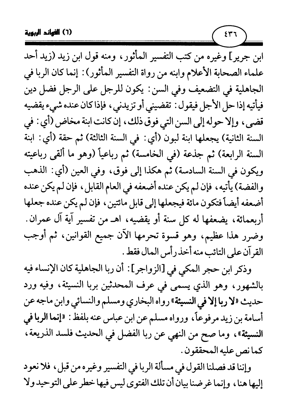 وذكر ابن حجر المكي في [الزواجر] : أن ربا الجاهلية كان الإنساء فيه بالشهور، وهو الذي يسمى في عرف المحدثين بربا النسيئة، وفيه ورد حديث «لا ربا إلا في النسيئة (¬1) » رواه البخاري ومسلم والنسائي وابن ماجه عن أسامة بن زيد مرفوعا، ورواه مسلم عن ابن عباس عنه بلفظ: «إنما الربا في النسيئة (¬2) » ، وما صح من النهي عن ربا الفضل في الحديث فلسد الذريعة، كما نص عليه المحققون.