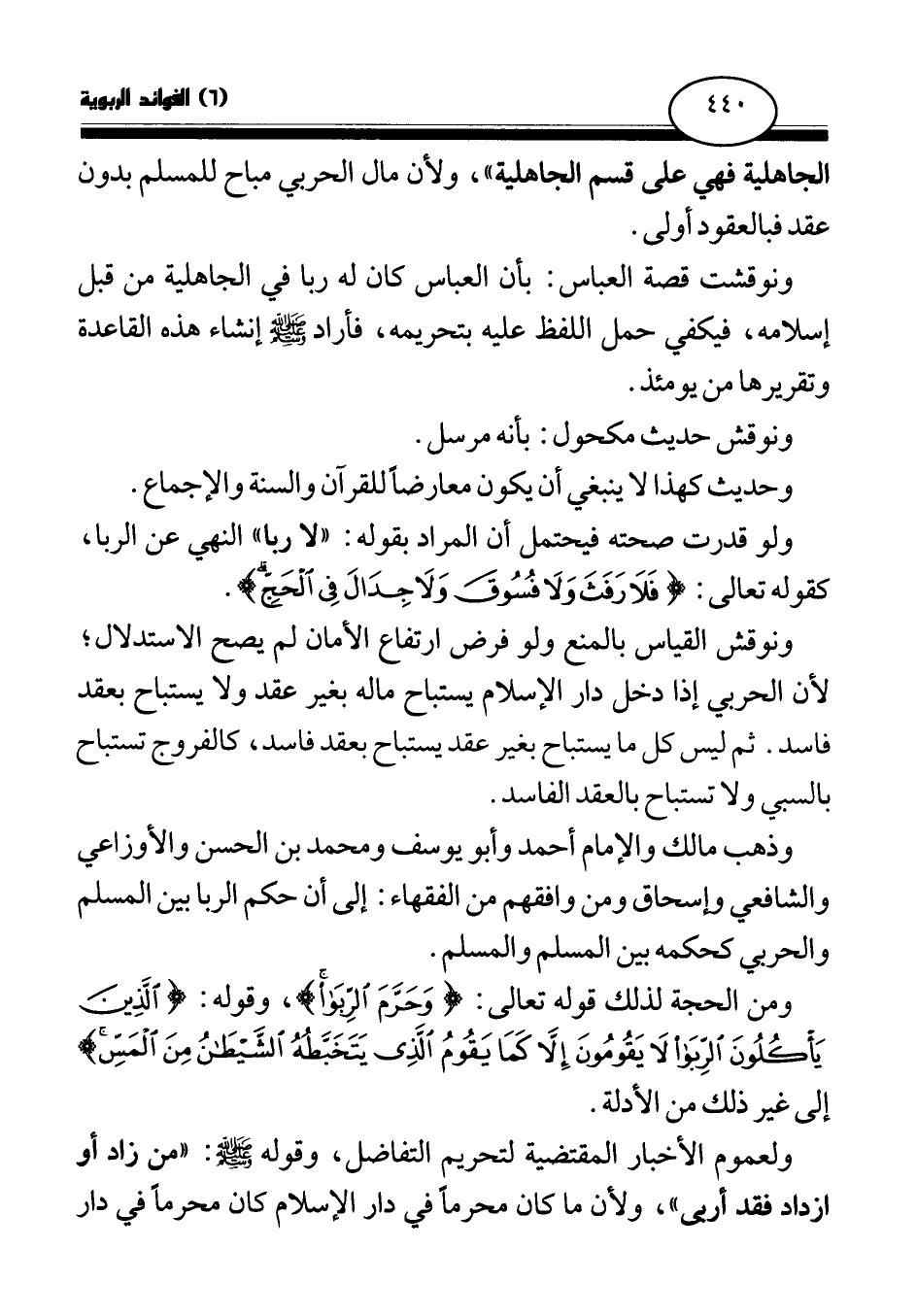 ونوقشت قصة العباس: بأن العباس كان له ربا في الجاهلية من قبل إسلامه، فيكفي حمل اللفظ عليه بتحريمه، فأراد - صلى الله عليه وسلم - إنشاء هذه القاعدة وتقريرها من يومئذ.