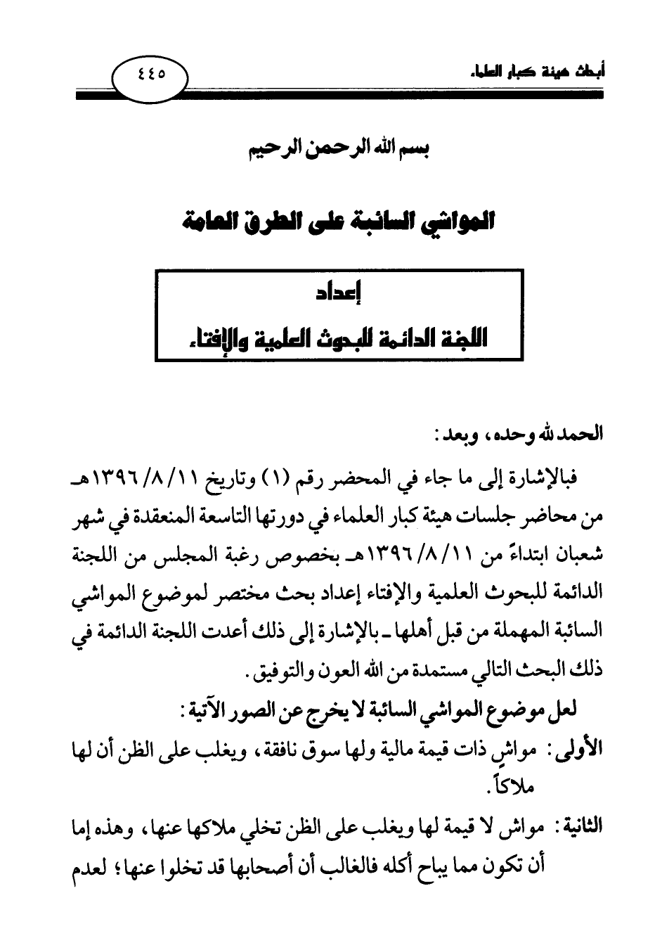 فبالإشارة إلى ما جاء في المحضر رقم (1) وتاريخ 11\ 8\ 1396 هـ من محاضر جلسات هيئة كبار العلماء في دورتها التاسعة المنعقدة في شهر شعبان ابتداء من 11 \8 \1396 هـ بخصوص رغبة المجلس من اللجنة الدائمة للبحوث العلمية والإفتاء إعداد بحث مختصر لموضوع المواشي السائبة المهملة من قبل أهلها - بالإشارة إلى ذلك أعدت اللجنة الدائمة في ذلك البحث التالي مستمدة من الله العون والتوفيق.