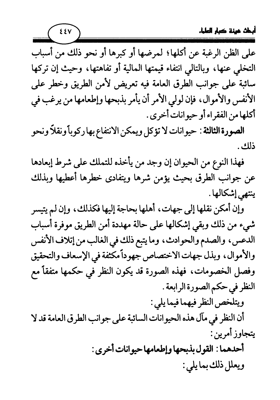 وإن أمكن نقلها إلى جهات، أهلها بحاجة إليها فكذلك، وإن لم يتيسر شيء من ذلك وبقي إشكالها على حالة مهددة أمن الطريق موفرة أسباب الدعس، والصدم والحوادث، وما يتبع ذلك في الغالب من إتلاف الأنفس والأموال، وبذل جهات الاختصاص جهودا مكثفة في الإسعاف والتحقيق وفصل الخصومات، فهذه الصورة قد يكون النظر في حكمها متفقا مع النظر في حكم الصورة الرابعة.