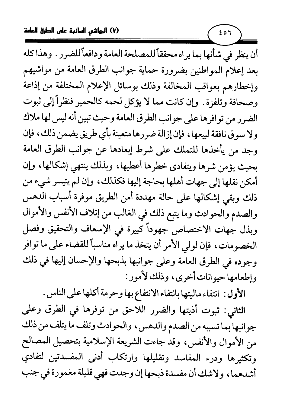 أن ينظر شأنها بما يراه محققا للمصلحة العامة ودافعا للضرر. وهذا كله بعد إعلام المواطنين بضرورة حماية جوانب الطرق العامة من مواشيهم وإخطارهم بعواقب المخالفة وذلك بوسائل الإعلام المختلفة من إذاعة وصحافة وتلفزة. وإن كانت مما لا يؤكل لحمه كالحمير فنظرا إلى ثبوت الضرر من توافرها على جوانب الطرق العامة وحيث تبين أنه ليس لها ملاك ولا سوق نافقة لبيعها، فإن إزالة ضررها متعينة بأي طريق يضمن ذلك، فإن وجد من يأخذها للتملك على شرط إبعادها عن جوانب الطرق العامة بحيث يؤمن شرها ويتفادى خطرها أعطيها، وبذلك ينتهي إشكالها، وإن أمكن نقلها إلى جهات أهلها بحاجة إليها فكذلك، وإن لم يتيسر شيء من ذلك وبقي إشكالها على حالة مهددة أمن الطريق موفرة أسباب الدهس والصدم والحوادث وما يتبع ذلك في الغالب من إتلاف الأنفس والأموال وبذل جهات الاختصاص جهودا كبيرة في الإسعاف والتحقيق وفصل الخصومات، فإن لولي الأمر أن يتخذ ما يراه مناسبا للقضاء على ما توافر وجوده في الطرق العامة وعلى جوانبها بذبحها والإحسان إليها في ذلك وإطعامها حيوانات أخرى، وذلك لأمور: