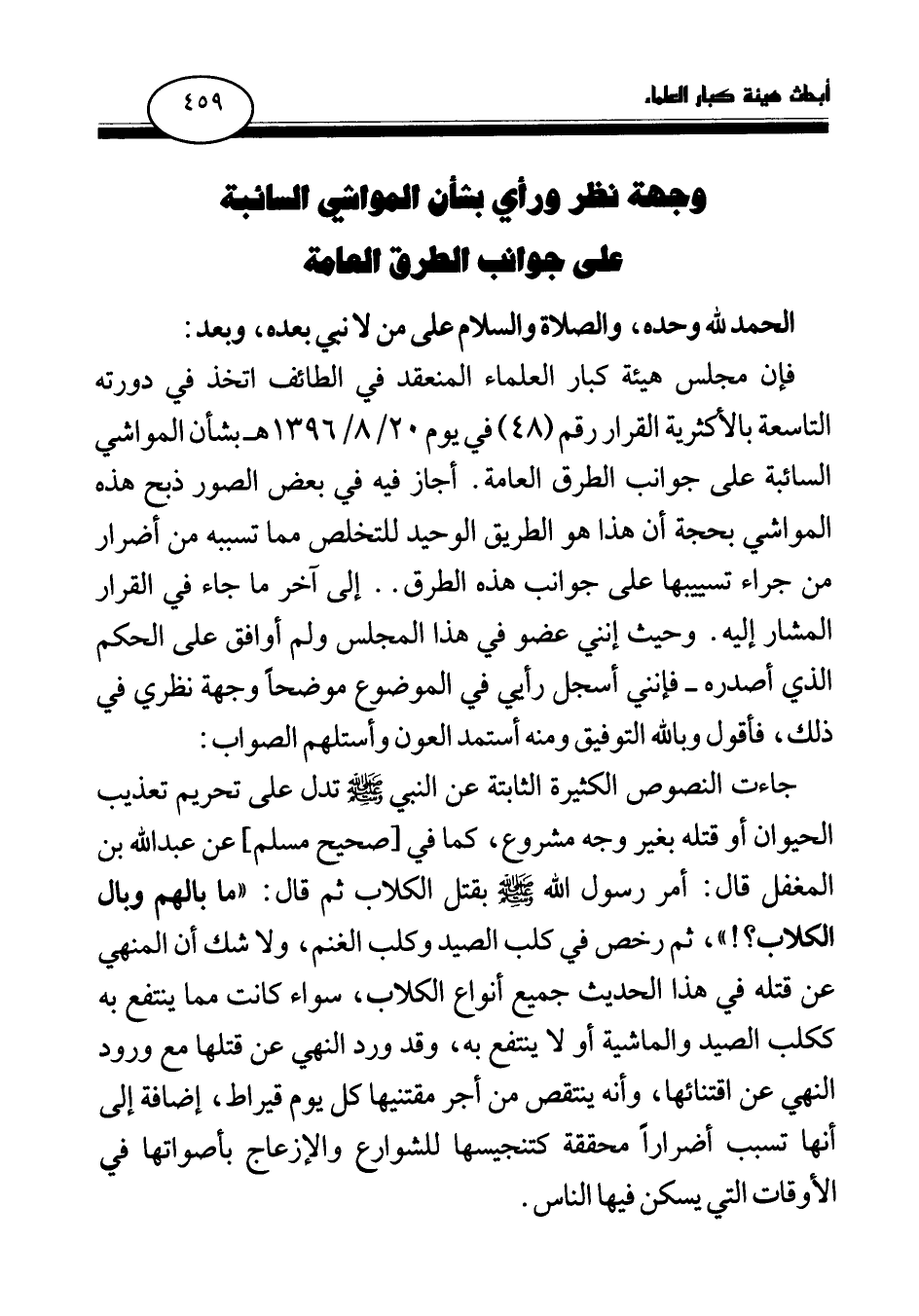 فإن مجلس هيئة كبار العلماء المنعقد في الطائف اتخذ في دورته التاسعة بالأكثرية القرار رقم (48) في يوم 20 \ 8 \ 1396 هـ بشأن المواشي السائبة على جوانب الطرق العامة. أجاز فيه في بعض الصور ذبح هذه المواشي بحجة أن هذا هو الطريق الوحيد للتخلص مما تسببه من أضرار من جراء تسييبها على جوانب هذه الطرق. . إلى آخر ما جاء في القرار المشار إليه. وحيث إنني عضو في هذا المجلس ولم أوافق على الحكم الذي أصدره- فإنني أسجل رأيي في الموضوع موضحا وجهة نظري في ذلك، فأقول وبالله التوفيق ومنه أستمد العون وأستلهم الصواب: