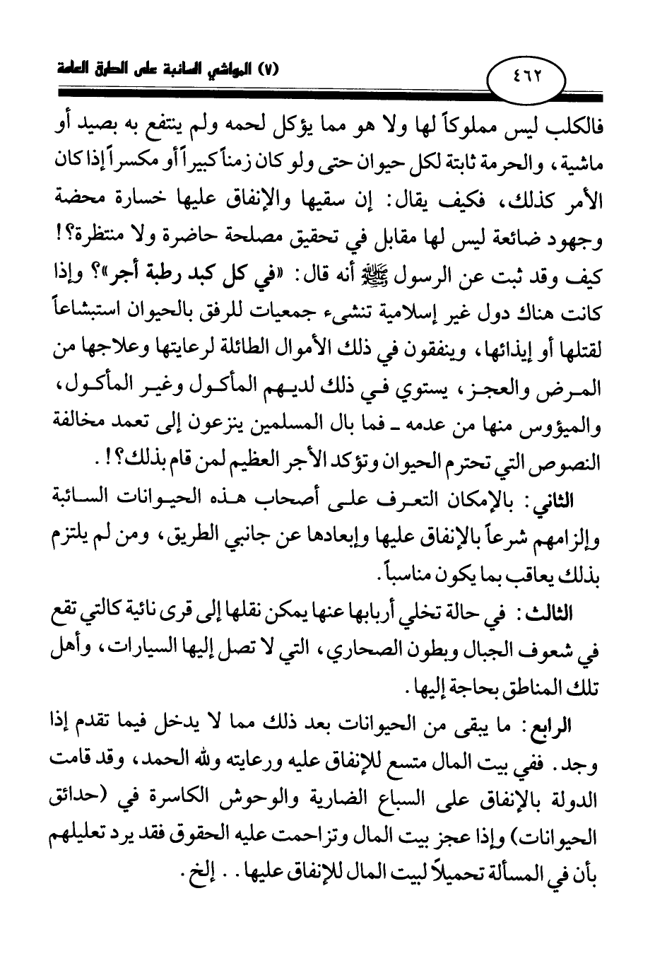 الرابع: ما يبقى من الحيوانات بعد ذلك مما لا يدخل فيما تقدم إذا وجد. ففي بيت المال متسع للإنفاق عليه ورعايته ولله الحمد، وقد قامت الدولة بالإنفاق على السباع الضارية والوحوش الكاسرة في (حدائق الحيوانات) وإذا عجز بيت المال وتزاحمت عليه الحقوق فقد يرد تعليلهم بأن في المسألة تحميلا لبيت المال للإنفاق عليهما. . إلخ.