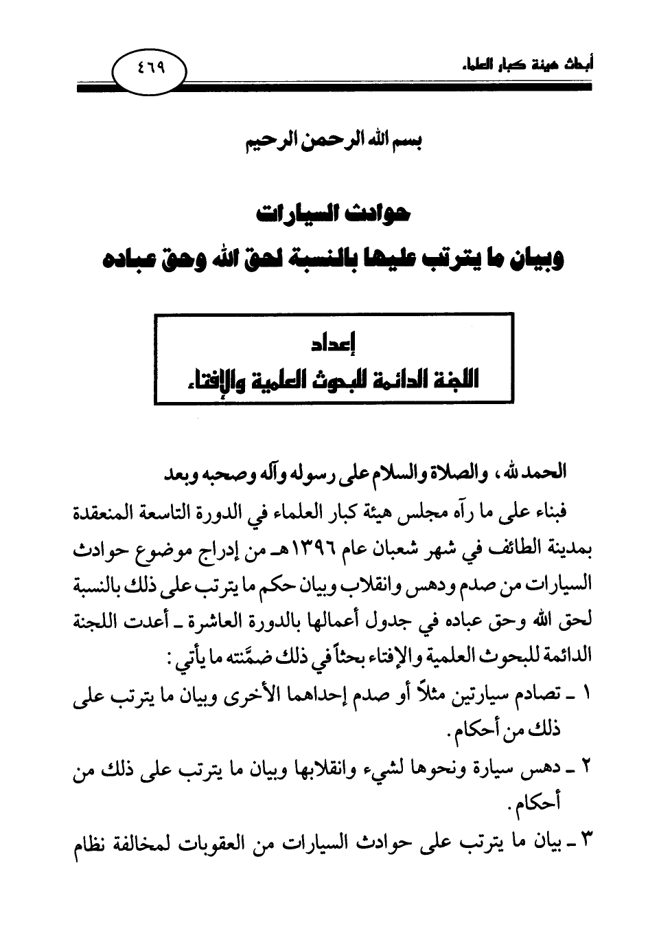 فبناء على ما رآه مجلس هيئة كبار العلماء في الدورة التاسعة المنعقدة بمدينة الطائف في شهر شعبان عام 1396 هـ من إدراج موضوع حوادث السيارات من صدم ودهس وانقلاب وبيان حكم ما يترتب على ذلك بالنسبة لحق الله وحق عباده في جدول أعمالها بالدورة العاشرة- أعدت اللجنة الدائمة للبحوث العلمية والإفتاء بحثا في ذلك ضمنته ما يأتي: