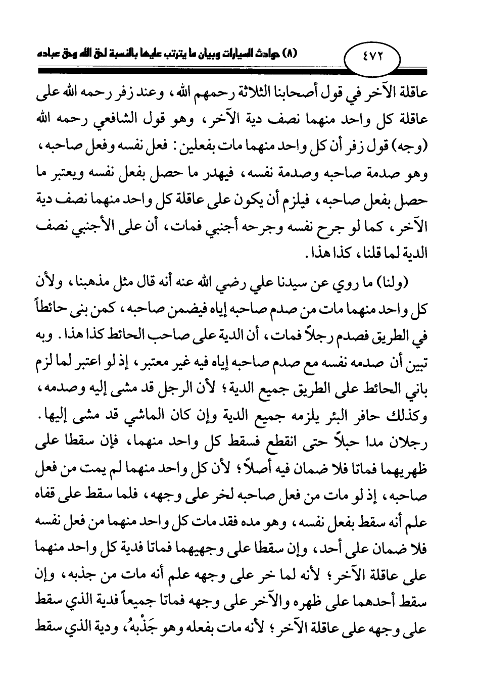 (ولنا) ما روي عن سيدنا علي رضي الله عنه أنه قال مثل مذهبنا، ولأن كل واحد منهما مات من صدم صاحبه إياه فيضمن صاحبه، كمن بنى حائطا في الطريق فصدم رجلا فمات، أن الدية على صاحب الحائط كذا هذا. وبه تبين أن صدمه نفسه مع صدم صاحبه إياه فيه غير معتبر، إذ لو اعتبر لما لزم باني الحائط على الطريق جميع الدية؛ لأن الرجل قد مشى إليه وصدمه، وكذلك حافر البئر يلزمه جميع الدية وإن كان الماشي قد مشى إليها. رجلان مدا حبلا حتى انقطع فسقط كل واحد منهما، فإن سقطا على ظهريهما فماتا فلا ضمان فيه أصلا؛ لأن كل واحد منهما لم يمت من فعل صاحبه، إذ لو مات من فعل صاحبه لخر على وجهه، فلما سقط على قفاه علم أنه سقط بفعل نفسه، وهو مده فقد مات كل واحد منهما من فعل نفسه فلا ضمان على أحد، وإن سقطا على وجهيهما فماتا فدية كل واحد منهما على عاقلة الآخر؛ لأنه لما خر على وجهه علم أنه مات من جذبه، وإن سقط أحدهما على ظهره والآخر على وجهه فماتا جميعا فدية الذي سقط على وجهه على عاقلة الآخر؛ لأنه مات بفعله وهو جذبه، ودية الذي سقط