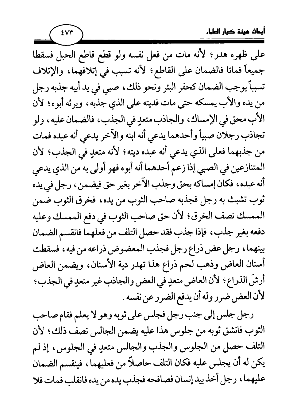 على ظهره هدر؛ لأنه مات من فعل نفسه ولو قطع قاطع الحبل فسقطا جميعا فماتا فالضمان على القاطع؛ لأنه تسبب في إتلافهما، والإتلاف تسببا يوجب الضمان كحفر البئر ونحو ذلك، صبي في يد أبيه جذبه رجل من يده والأب يمسكه حتى مات فديته على الذي جذبه، ويرثه أبوه، لأن الأب محق في الإمساك، والجاذب متعد في الجذب، فالضمان عليه، ولو تجاذب رجلان صبيا وأحدهما يدعي أنه ابنه والآخر يدعي أنه عبده فمات من جذبهما فعلى الذي يدعي أنه عبده ديته، لأنه متعد في الجذب؛ لأن المتنازعين في الصبي إذا زعم أحدهما أنه أبوه فهو أولى به من الذي يدعي أنه عبده، فكان إمساكه بحق وجذب الآخر بغير حق فيضمن، رجل في يده ثوب تشبث به رجل فجذبه صاحب الثوب من يده، فخرق الثوب ضمن الممسك نصف الخرق؛ لأن حق صاحب الثوب في دفع الممسك وعليه دفعه بغير جذب، فإذا جذب فقد حصل التلف من فعلهما فانقسم الضمان بينهما، رجل عض ذراع رجل فجذب المعضوض ذراعه من فيه، فسقطت أسنان العاض وذهب لحم ذراع هذا تهدر دية الأسنان، ويضمن العاض أرش الذراع؛ لأن العاض متعد في العض والجاذب غير متعد في الجذب: لأن العض ضرر وله أن يدفع الضرر عن نفسه.
