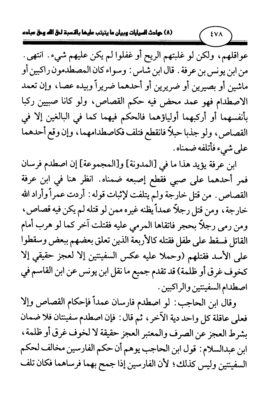 ابن عرفة يؤيد هذا ما في [المدونة] و [المجموعة] إن اصطدم فرسان فمر أحدهما على صبي فقطع إصبعه ضمناه. انظر هنا في ابن عرفة القصاص. من قتل خارجة ولم يتلفت لإثبات قوله: أردت عمرا وأراد الله خارجة، ومن قتل رجلا عمدا يظنه غيره ممن لو قتله لم يكن فيه قصاص، ومن رمى رجلا بحجر فاتقاها المرمي عليه فقتلت آخر كما لو هرب أمام القاتل فسقط على طفل فقتله كالأربعة الذين تعلق بعضهم ببعض وسقطوا على الأسد فقتلهم (وحملا عليه عكس السفينتين إلا لعجز حقيقي إلا كخوف غرق أو ظلمة) قد تقدم جميع ما نقل ابن يونس عن ابن القاسم في اصطدام السفينتين والراكبين.