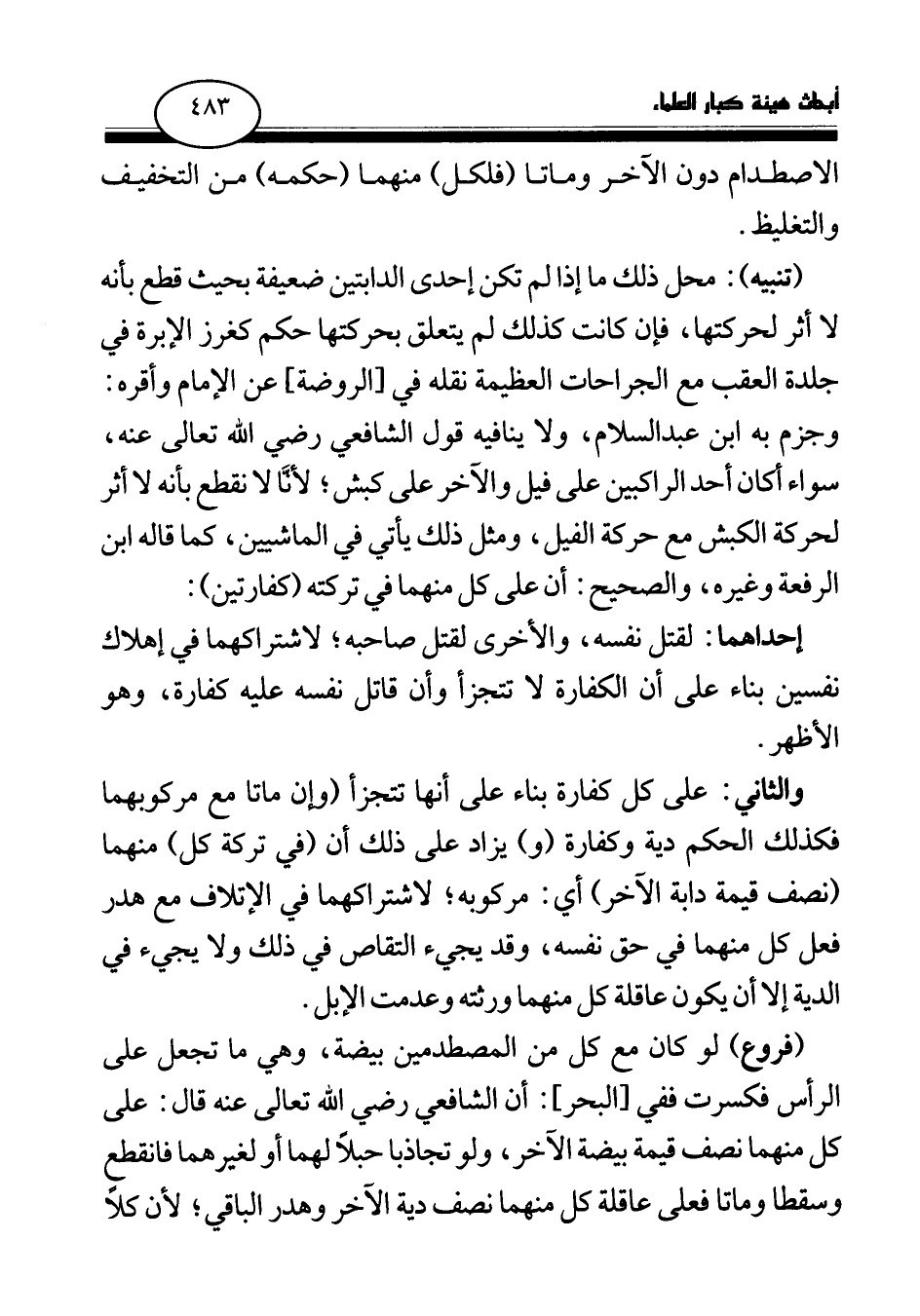 (تنبيه) : محل ذلك ما إذا لم تكن إحدى الدابتين ضعيفة بحيث قطع بأنه لا أثر لحركتها، فإن كانت كذلك لم يتعلق بحركتها حكم كغرز الإبرة في جلدة العقب مع الجراحات العظيمة نقله في [الروضة] ، عن الإمام وأقره: وجزم به ابن عبد السلام، ولا ينافيه قول الشافعي رضي الله تعالى عنه، سواء أكان أحد الراكبين على فيل والآخر على كبش، لأنا لا نقطع بأنه لا أثر لحركة الكبش مع حركة الفيل، ومثل ذلك يأتي في الماشيين، كما قاله ابن الرفعة وغيره، والصحيح: أن على كل منهما في تركته (كفارتين) :