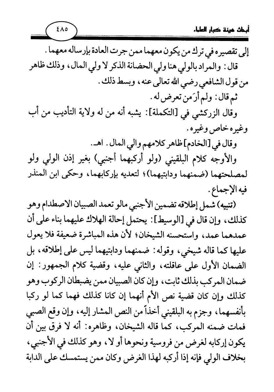 (تنبيه) شمل إطلاقه تضمين الأجنبي ما لو تعمد الصبيان الاصطدام وهو كذلك، وإن قال في [الوسيط] : يحتمل إحالة الهلاك عليهما بناء على أن عمدهما عمد، واستحسنه الشيخان؛ لأن هذه المباشرة ضعيفة فلا يعول عليها كما قاله شيخي، وقوله: ضمنهما ودابتيهما ليس على إطلاقه، بل الضمان الأول على عاقلته، والثاني عليه، وقضية كلام الجمهور: إن ضمان المركب بذلك ثابت، وإن كان الصبيان ممن يضبطان الركوب وهو كذلك وإن كان قضية نص الأم أنهما إن كانا كذلك فهما كما لو ركبا بأنفسهما، وجزم به البلقيني أخذا من النص المشار إليه، وإن وقع الصبي فمات ضمنه المركب، كما قاله الشيخان، وظاهره: أنه لا فرق بين أن يكون إركابه لغرض من فروسية ونحوها أو لا، وهو كذلك في الأجنبي، بخلاف الولي فإنه إذا أركبه لهذا الغرض وكان ممن يستمسك على الدابة