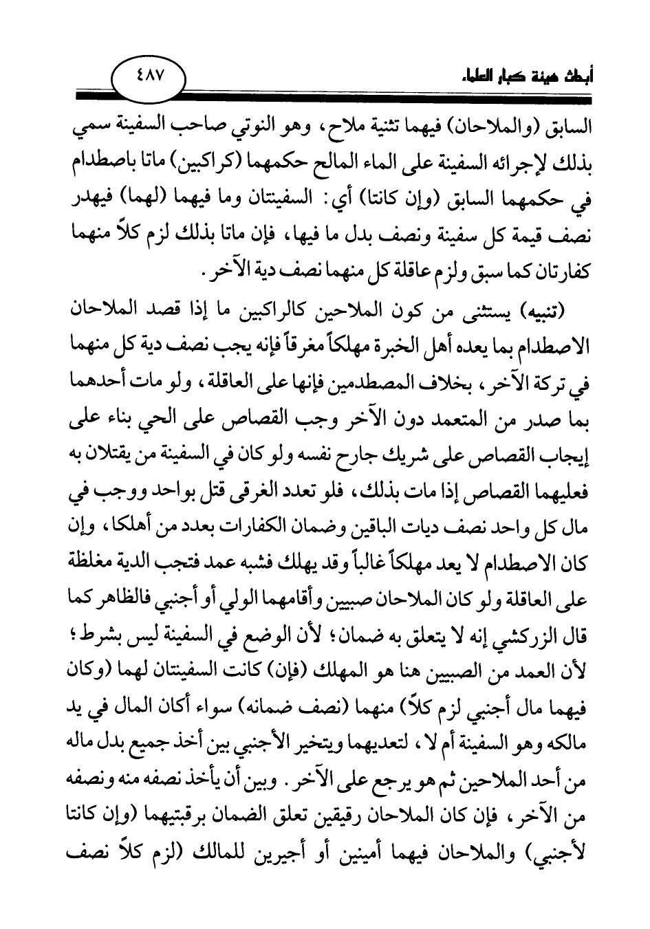 السابق (والملاحان) فيهما تثنية ملاح، وهو النوتي صاحب السفينة سمي بذلك لإجرائه السفينة على الماء المالح حكمهما (كراكبين) ماتا باصطدام في حكمهما السابق (وإن كانتا) أي: السفينتان وما فيهما (لهما) فيهدر نصف قيمة كل سفينة ونصف بدل ما فيها، فإن ماتا بذلك لزم كلا منهما كفارتان كما سبق ولزم عاقلة كل منهما نصف دية الآخر.