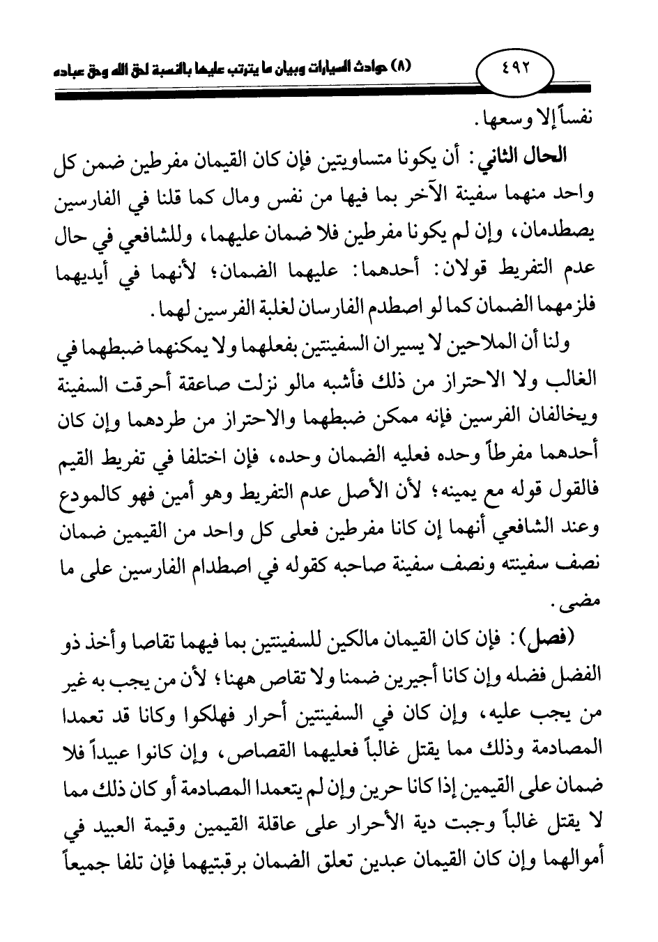 الحال الثاني: أن يكونا متساويتين فإن كان القيمان مفرطين ضمن كل واحد منهما سفينة الآخر بما فيها من نفس ومال كما قلنا في الفارسين يصطدمان، وإن لم يكونا مفرطين فلا ضمان عليهما، وللشافعي في حال عدم التفريط قولان: أحدهما: عليهما الضمان؛ لأنهما في أيديهما فلزمهما الضمان كما لو اصطدم الفارسان لغلبة الفرسين لهما.