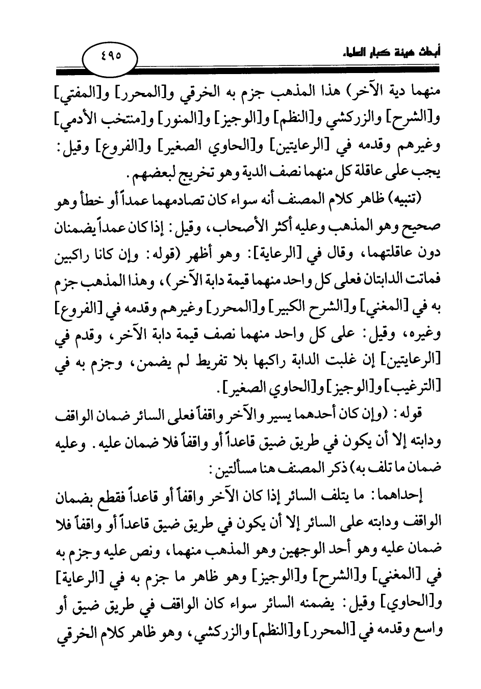 إحداهما: ما يتلف السائر إذا كان الآخر واقفا أو قاعدا فقطع بضمان الواقف ودابته على السائر إلا أن يكون في طريق ضيق قاعدا أو واقفا فلا ضمان عليه وهو أحد الوجهين وهو المذهب منهما، ونص عليه وجزم به في [المغني] ، و [الشرح] ، و [الوجيز] ، وهو ظاهر ما جزم به في [الرعاية] ، و [الحاوي] وقيل: يضمنه السائر سواء كان الواقف في طريق ضيق أو واسع وقدمه في [المحرر] ، و [النظم] ، والزركشي، وهو ظاهر كلام الخرقي