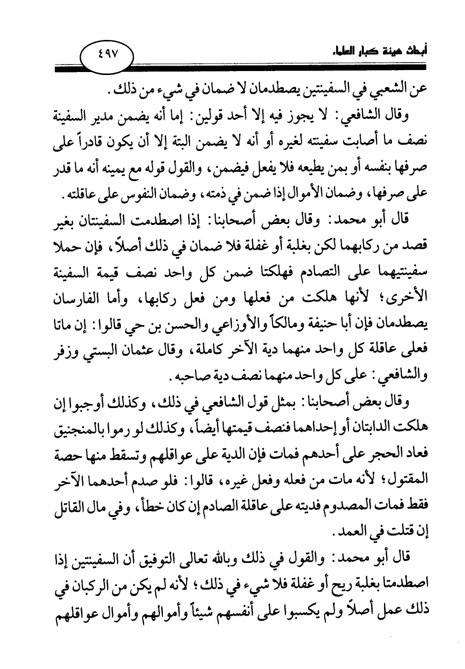 قال أبو محمد: وقال بعض أصحابنا: إذا اصطدمت السفينتان بغير قصد من ركابهما لكن بغلبة أو غفلة فلا ضمان في ذلك أصلا، فإن حملا سفينتهما على التصادم فهلكتا ضمن كل واحد نصف قيمة السفينة الأخرى؛ لأنها هلكت من فعلها ومن فعل ركابها، وأما الفارسان يصطدمان فإن أبا حنيفة ومالكا والأوزاعي والحسن بن حيي قالوا: إن ماتا فعلى عاقلة كل واحد منهما دية الآخر كاملة، وقال عثمان البستي وزفر والشافعي: على كل واحد منهما نصف في دية صاحبه.