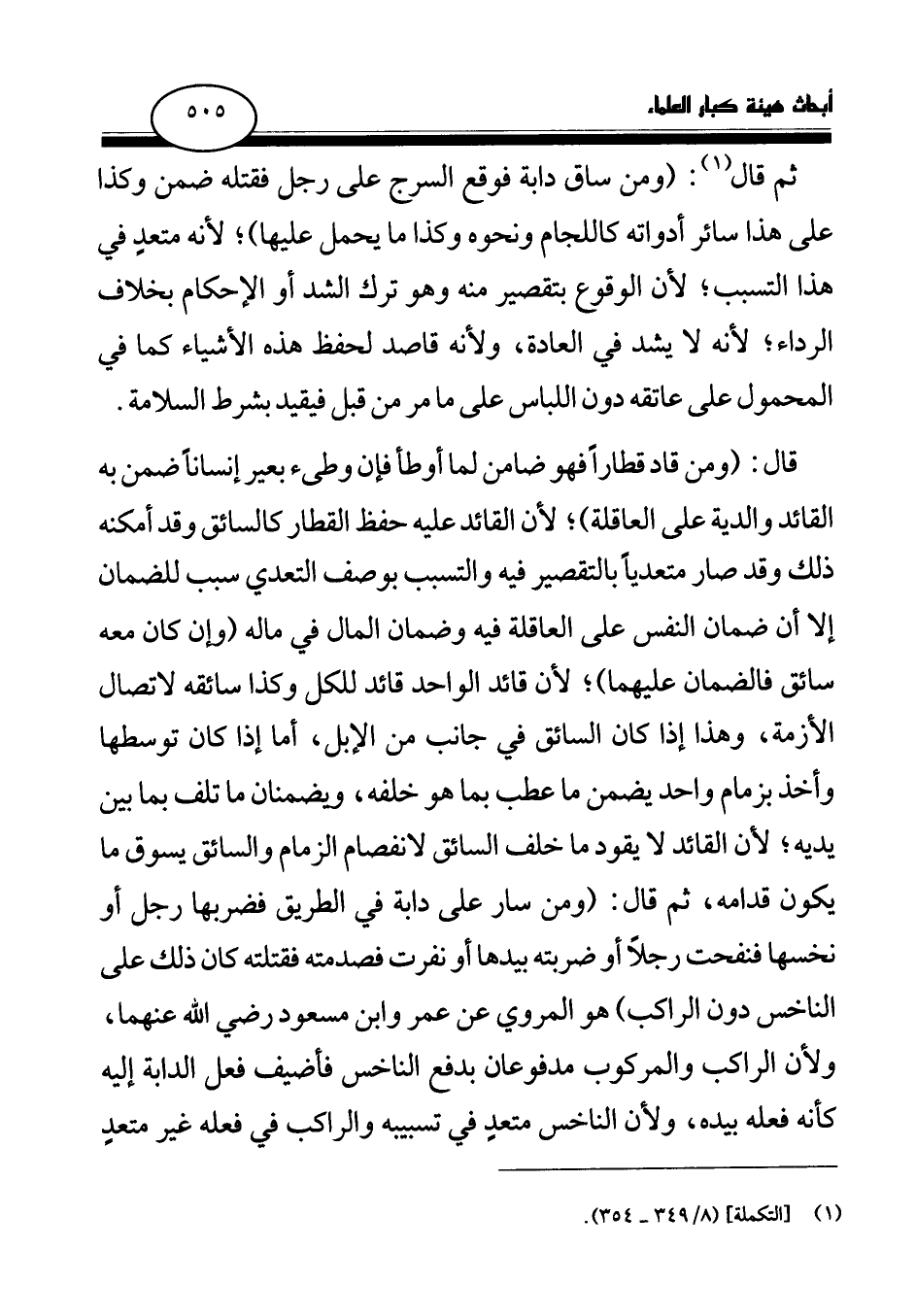 ثم قال (¬1) (ومن ساق دابة فوقع السرج على رجل فقتله ضمن، وكذا على هذا سائر أدواته كاللجام ونحوه، وكذا ما يحمل عليها) ؛ لأنه متعد في هذا التسبب؛ لأن الوقوع بتقصير منه وهو ترك الشد أو الإحكام بخلاف الرداء؛ لأنه لا يشد في العادة، ولأنه قاصد لحفظ هذه الأشياء كما في المحمول على عاتقه دون اللباس على ما مر من قبل فيقيد بشرط السلامة.