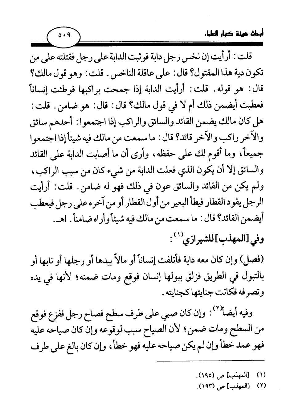 قلت: أرأيت إن نخس رجل دابة فوثبت الدابة على رجل فقتلته على من تكون دية هذا المقتول؛ قال: على عاقلة الناخس. قلت: وهو قول مالك؟ قال: هو قوله. قلت: أرأيت الدابة إذا جمحت براكبها فوطئت إنسانا فعطبت أيضمن ذلك أم لا في قول مالك؟ قال: قال: هو ضامن. قلت: هل كان مالك يضمن القائد والسائق والراكب إذا اجتمعوا: أحدهم سائق والآخر راكب والآخر قائد؟ قال: ما سمعت من مالك فيه شيئا إذا اجتمعوا جميعا، وما أقوم لك على حفظه، وأرى أن ما أصابت الدابة على القائد والسائق إلا أن يكون الذي فعلت الدابة من شيء كان من سبب الراكب، ولم يكن من القائد والسائق عون في ذلك فهو له ضامن. قلت: أرأيت الرجل يقود القطار فيطأ البعير من أول القطار أو من آخره على رجل فيعطب أيضمن القائد؟ قال: ما سمعت من مالك فيه شيئا وأراه ضامنا. اهـ.