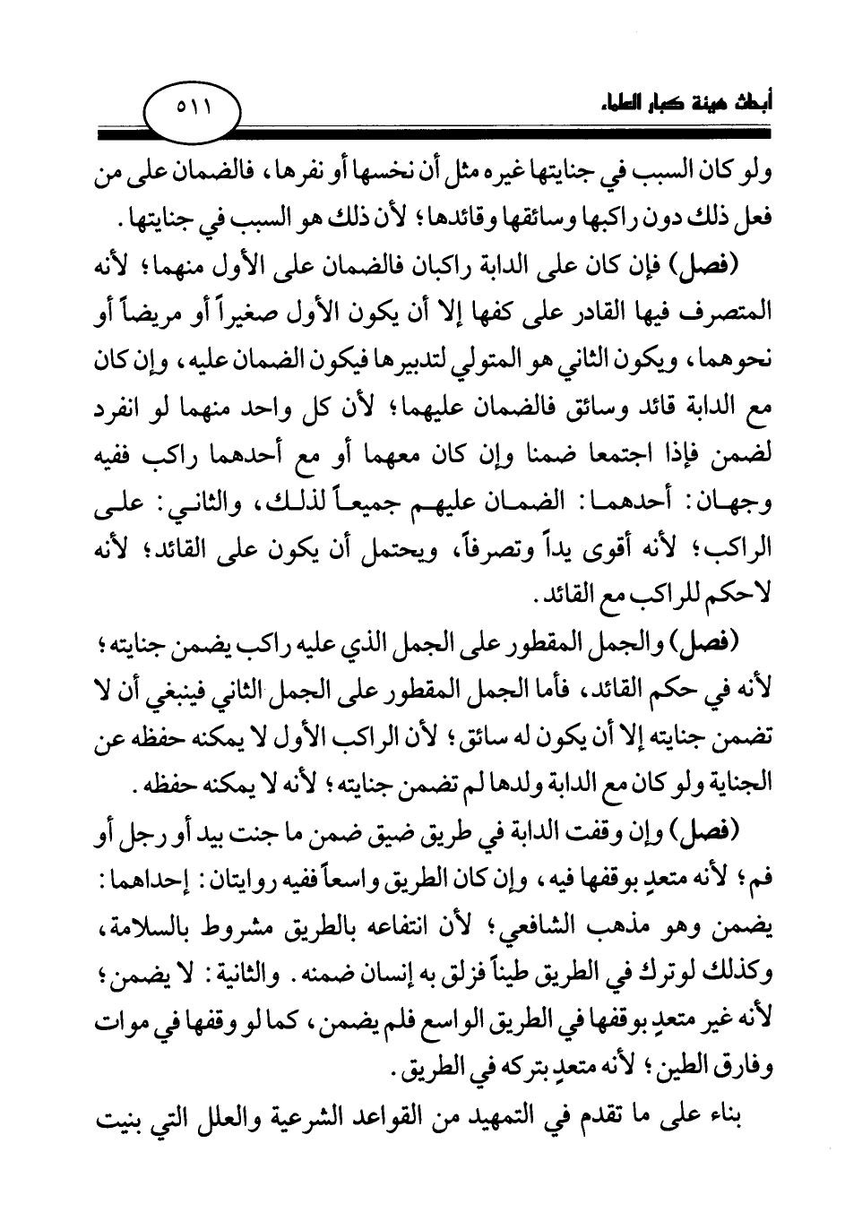 (فصل) فإن كان على الدابة راكبان فالضمان على الأول منهما؛ لأنه المتصرف فيها القادر على كفها إلا أن يكون الأول صغيرا أو مريضا أو نحوهما، ويكون الثاني هو المتولي لتدبيرها فيكون الضمان عليه، وإن كان مع الدابة قائد وسائق فالضمان عليهما، لأن كل واحد منهما لو انفرد لضمن فإذا اجتمعا ضمنا وإن كان معهما أو مع أحدهما راكب ففيه وجهان: أحدهما: الضمان عليهم جميعا لذلك، والثاني: على الراكب؛ لأنه أقوى يدا وتصرفا، ويحتمل أن يكون على القائد؛ لأنه لا حكم للراكب مع القائد.