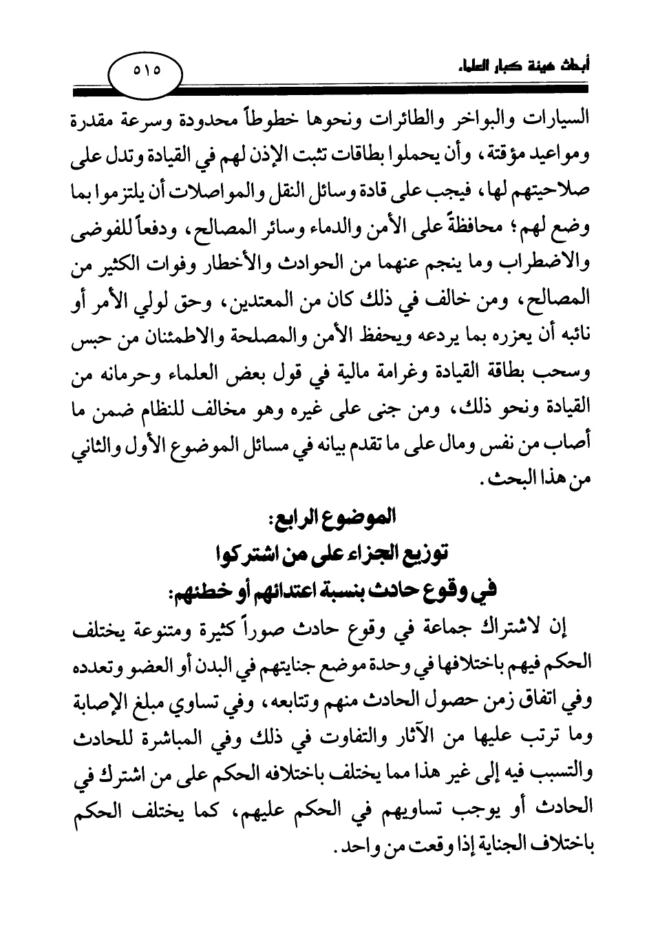 السيارات والبواخر والطائرات ونحوها خطوطا محدودة وسرعة مقدرة ومواعيد مؤقتة، وأن يحملوا بطاقات تثبت الإذن لهم في القيادة وتدل على صلاحيتهم لها، فيجب على قادة وسائل النقل والمواصلات أن يلتزموا بما وضع لهم؛ محافظة على الأمن والدماء وسائر المصالح، ودفعا للفوضى والاضطراب وما ينجم عنهما من الحوادث والأخطار وفوات الكثير من المصالح، ومن خالف في ذلك كان من المعتدين، وحق لولي الأمر أو نائبه أن يعزره بما يردعه ويحفظ الأمن والمصلحة والاطمئنان من حبس وسحب بطاقة القيادة وغرامة مالية في قول بعض العلماء وحرمانه من القيادة ونحو ذلك، ومن جنى على غيره، وهو مخالف للنظام ضمن ما أصاب من نفس ومال على ما تقدم بيانه في مسائل الموضوع الأول والثاني من هذا البحث.