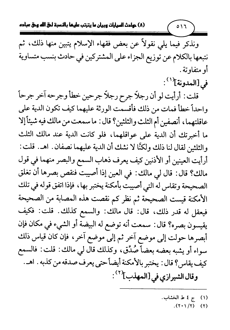 ونذكر فيما يلي نقولا عن بعض فقهاء الإسلام يتبين منها ذلك، ثم نتبعها بالكلام عن توزيع الجزاء على المشتركين في حادث بنسب متساوية أو متفاوتة.