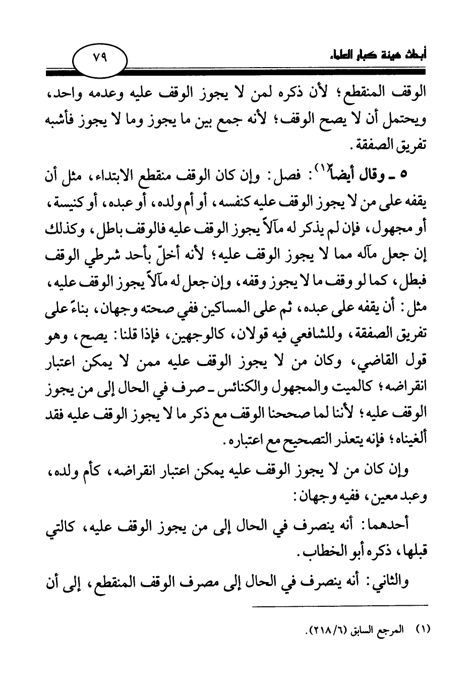 5 - وقال أيضا (¬1) : فصل: وإن كان الوقف منقطع الابتداء، مثل أن يقفه على من لا يجوز الوقف عليه كنفسه، أو أم ولده، أو عبده، أو كنيسة، أو مجهول، فإن لم يذكر له مآلا يجوز الوقف عليه فالوقف باطل، وكذلك إن جعل مآله مما لا يجوز الوقف عليه؛ لأنه أخل بأحد شرطي الوقف فبطل، كما لو وقف ما لا يجوز وقفه، وإن جعل له مآلا يجوز الوقف عليه، مثل: أن يقفه على عبده، ثم على المساكين ففي صحته وجهان، بناء على تفريق الصفقة، وللشافعي فيه قولان، كالوجهين، فإذا قلنا: يصح، وهو قول القاضي، وكان من لا يجوز الوقف عليه ممن لا يمكن اعتبار انقراضه؛ كالميت والمجهول والكنائس- صرف في الحال إلى من يجوز الوقف عليه؛ لأننا لما صححنا الوقف مع ذكر ما لا يجوز الوقف عليه فقد ألغيناه؛ فإنه يتعذر التصحيح مع اعتباره.