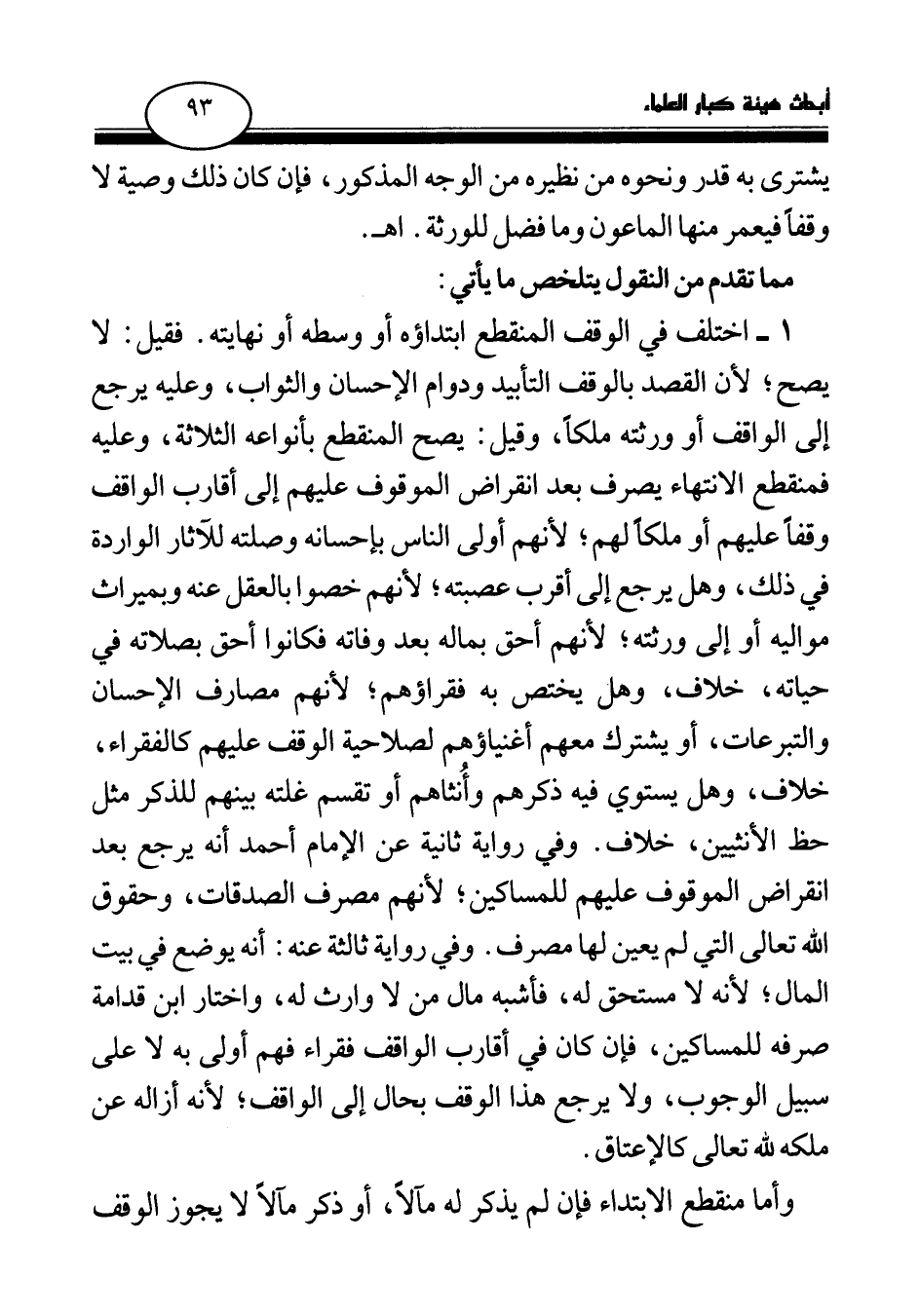 1 - اختلف في الوقف المنقطع ابتداؤه أو وسطه أو نهايته. فقيل: لا يصح، لأن القصد بالوقف التأبيد ودوام الإحسان والثواب، وعليه يرجع إلى الواقف أو ورثته ملكا، وقيل: يصح المنقطع بأنواعه الثلاثة، وعليه فمنقطع الانتهاء يصرف بعد انقراض الموقوف عليهم إلى أقارب الواقف وقفا عليهم أو ملكا لهم؛ لأنهم أولى الناس بإحسانه وصلته للآثار الواردة في ذلك، وهل يرجع إلى أقرب عصبته، لأنهم خصوا بالعقل عنه وبميراث مواليه أو إلى ورثته، لأنهم أحق بماله بعد وفاته فكانوا أحق بصلاته في حياته، خلاف، وهل يختص به فقراؤهم؛ لأنهم مصارف الإحسان والتبرعات، أو يشترك معهم أغنياؤهم لصلاحية الوقف عليهم كالفقراء، خلاف، وهل يستوي فيه ذكرهم وأنثاهم أو تقسم غلته بينهم للذكر مثل حظ الأنثيين، خلاف. وفي رواية ثانية عن الإمام أحمد أنه يرجع بعد انقراض الموقوف عليهم للمساكين؛ لأنهم مصرف الصدقات، وحقوق الله تعالى التي لم يعين لها مصرف. وفي رواية ثالثة عنه: أنه يوضع في بيت المال؛ لأنه لا مستحق له، فأشبه مال من لا وارث له، واختار ابن قدامة صرفه للمساكين، فإن كان في أقارب الواقف فقراء فهم أولى به لا على سبيل الوجوب، ولا يرجع هذا الوقف بحال إلى الواقف، لأنه أزاله عن ملكه لله تعالى كالإعتاق.