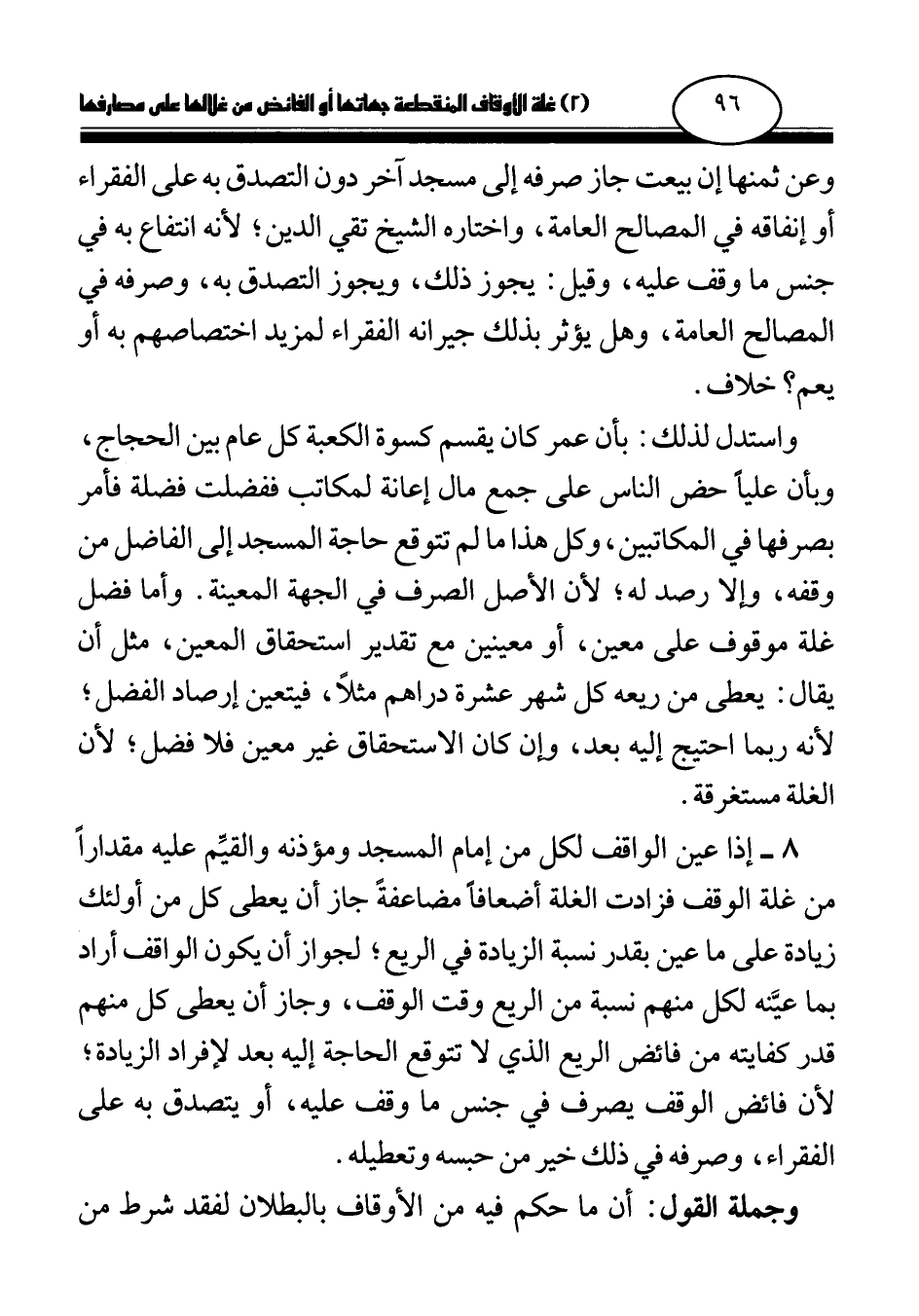 8 - إذا عين الواقف لكل من إمام المسجد ومؤذنه والقيم عليه مقدارا من غلة الوقف فزادت الغلة أضعافا مضاعفة جاز أن يعطى كل من أولئك زيادة على ما عين بقدر نسبة الزيادة في الريع؛ لجواز أن يكون الواقف أراد بما عينه لكل منهم نسبة من الريع وقت الوقف، وجاز أن يعطى كل منهم قدر كفايته من فائض الريع الذي لا تتوقع الحاجة إليه بعد لإفراد الزيادة؛ لأن فائض الوقف يصرف في جنس ما وقف عليه، أو يتصدق به على الفقراء، وصرفه في ذلك خير من حبسه وتعطيله.