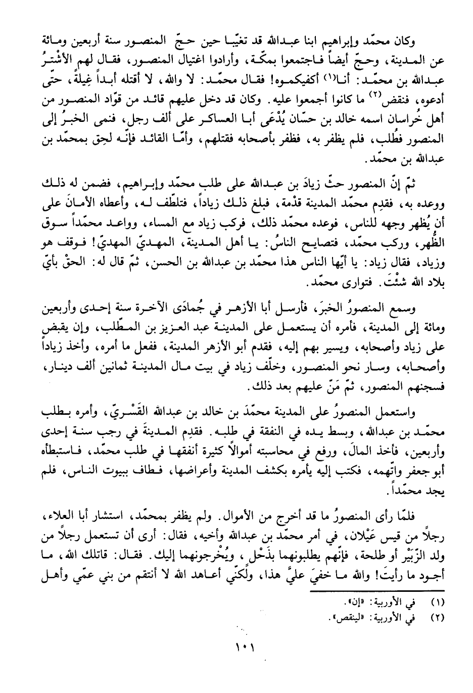 ثُمَّ إِنَّ الْمَنْصُورَ حَثَّ زِيَادَ بْنَ عَبْدِ اللَّهِ عَلَى طَلَبِ مُحَمَّدٍ وَإِبْرَاهِيمَ، فَضَمِنَ لَهُ ذَلِكَ وَوَعَدَهُ بِهِ، فَقَدِمَ مُحَمَّدٌ الْمَدِينَةَ قَدْمَةً، فَبَلَغَ ذَلِكَ زِيَادًا، فَتَلَطَّفَ لَهُ، وَأَعْطَاهُ الْأَمَانَ عَلَى أَنْ يُظْهِرَ وَجْهَهُ لِلنَّاسِ، فَوَعَدَهُ مُحَمَّدٌ ذَلِكَ، فَرَكِبَ زِيَادٌ مَعَ الْمَسَاءِ وَوَاعَدَ مُحَمَّدًا سُوقَ الظُّهْرِ، وَرَكِبَ مُحَمَّدٌ، فَتَصَايَحَ النَّاسُ: يَا أَهْلَ الْمَدِينَةِ، الْمَهْدِيُّ الْمَهْدِيُّ! فَوَقَفَ هُوَ وَزِيَادٌ، فَقَالَ زِيَادٌ: يَا أَيُّهَا النَّاسُ، هَذَا مُحَمَّدُ بْنُ عَبْدِ اللَّهِ بْنِ الْحَسَنِ، ثُمَّ قَالَ لَهُ: الْحَقْ بِأَيِّ بِلَادِ اللَّهِ شِئْتَ. فَتَوَارَى مُحَمَّدٌ.