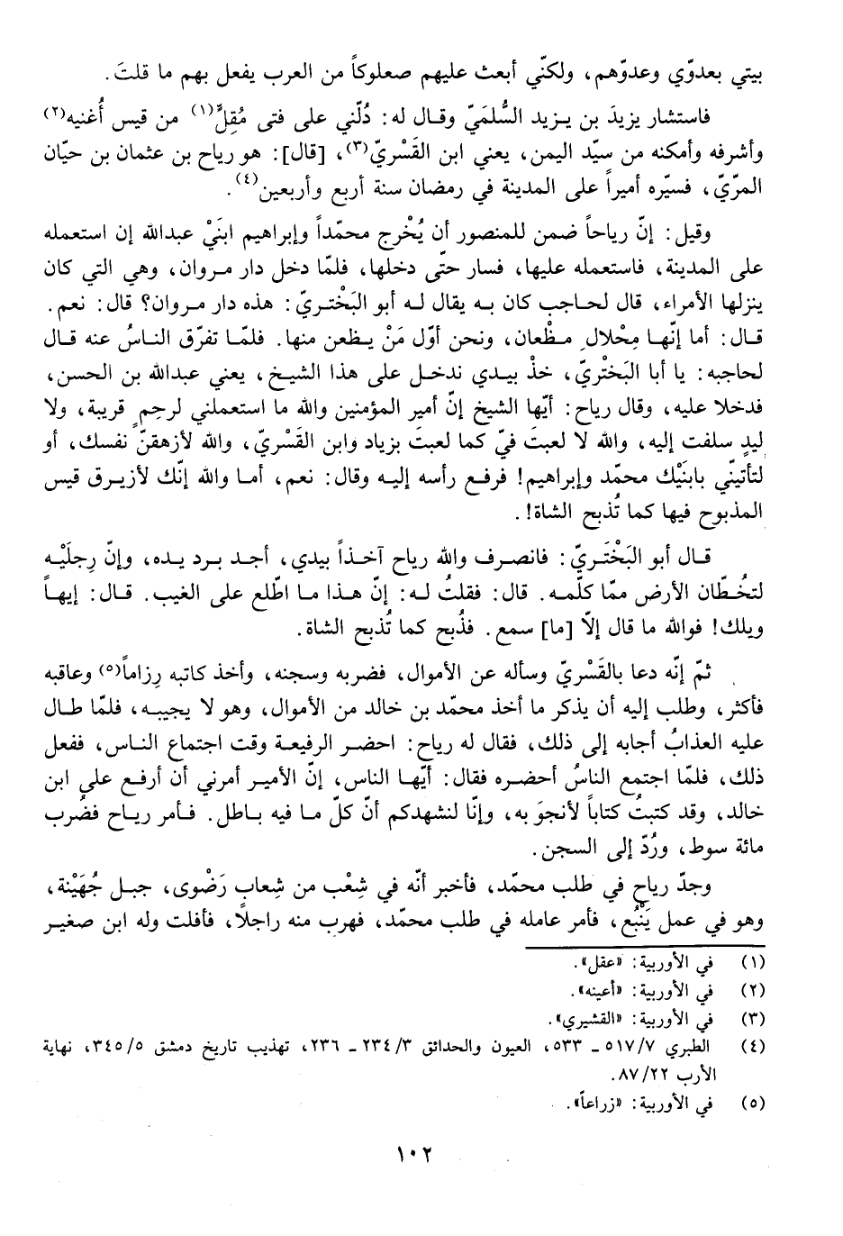 فَلَمَّا تَفَرَّقَ النَّاسُ عَنْهُ قَالَ لِحَاجِبِهِ: يَا أَبَا الْبَخْتَرِيِّ، خُذْ بِيَدِي نَدْخُلْ عَلَى هَذَا الشَّيْخِ، يَعْنِي عَبْدَ اللَّهِ بْنَ الْحَسَنِ، فَدَخَلَا عَلَيْهِ، وَقَالَ رِيَاحٌ: أَيُّهَا الشَّيْخُ، إِنَّ أَمِيرَ الْمُؤْمِنِينَ وَاللَّهِ مَا اسْتَعْمَلَنِي لِرَحِمٍ قَرِيبَةٍ، وَلَا لِيَدٍ سَلَفَتْ إِلَيْهِ، وَاللَّهِ لَا لَعِبْتَ فِيَّ كَمَا لَعِبْتَ بِزِيَادٍ وَابْنِ الْقَسْرِيِّ، وَاللَّهِ لَأُزْهِقَنَّ نَفْسَكَ، أَوْ لَتَأْتِيَنِّي بِابْنَيْكَ مُحَمَّدٍ وَإِبْرَاهِيمَ! فَرَفَعَ رَأَسَهُ إِلَيْهِ وَقَالَ: نَعَمْ، أَمَا وَاللَّهِ إِنَّكَ لَأُزَيْرِقُ قَيْسٍ الْمَذْبُوحُ فِيهَا كَمَا تُذْبَحُ الشَّاةُ! .
