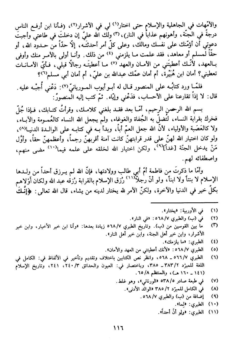 وَأَنَا أَوْلَى بِالْأَمْرِ مِنْكَ وَأَوْفَى بِالْعَهْدِ، لِأَنَّكَ أَعْطَيْتَنِي مِنَ الْأَمَانِ وَالْعَهْدِ مَا أَعْطَيْتَهُ رِجَالًا قَبْلِي، فَأَيُّ الْأَمَانَاتِ تُعْطِينِي؟ أَمَانُ ابْنِ هُبَيْرَةَ، أَمْ أَمَانُ عَمِّكَ عَبْدِ اللَّهِ بْنِ عَلِيٍّ، أَمْ أَمَانُ أَبِي مُسْلِمٍ؟