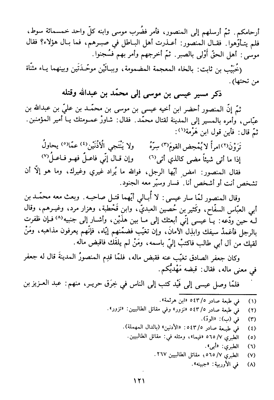 ثُمَّ إِنَّ الْمَنْصُورَ أَحْضَرَ ابْنَ أَخِيهِ عِيسَى بْنَ مُوسَى بْنِ مُحَمَّدِ بْنِ عَلِيِّ بْنِ عَبْدِ اللَّهِ بْنِ عَبَّاسٍ وَأَمَرَهُ بِالْمَسِيرِ إِلَى الْمَدِينَةِ لِقِتَالِ مُحَمَّدٍ. فَقَالَ: شَاوِرْ عُمُومَتَكَ يَا أَمِيرَ الْمُؤْمِنِينَ.