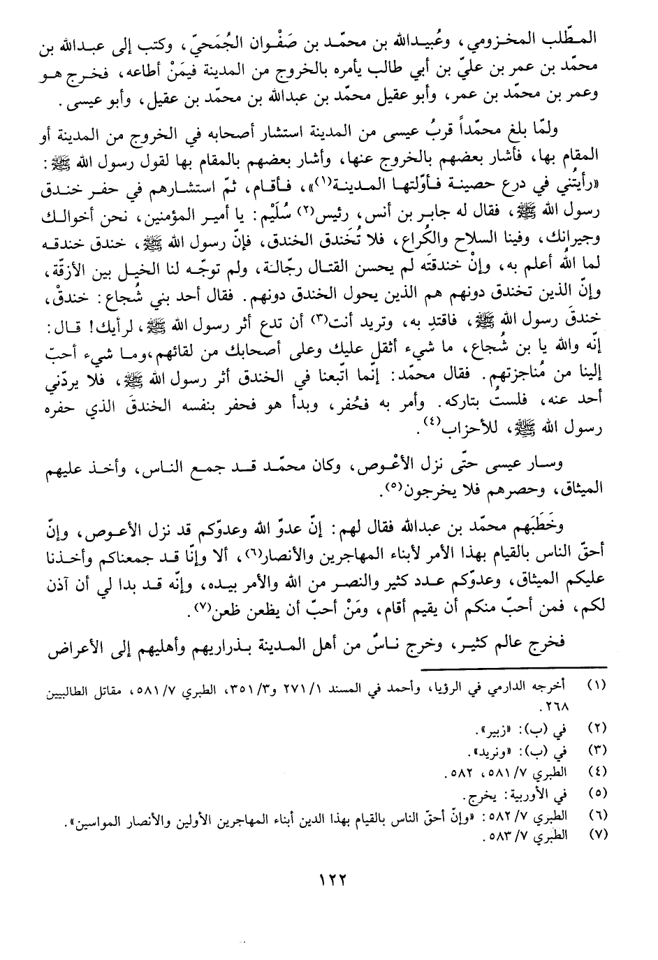 فَقَالَ أَحَدُ بَنِي شُجَاعٍ: خَنْدِقْ، خَنْدَقَ رَسُولُ اللَّهِ - صَلَّى اللَّهُ عَلَيْهِ وَسَلَّمَ - فَاقْتَدِ بِهِ، وَتُرِيدُ أَنْتَ أَنْ تَدَعَ أَثَرَ رَسُولِ اللَّهِ - صَلَّى اللَّهُ عَلَيْهِ وَسَلَّمَ - لِرَأْيِكَ! قَالَ: إِنَّهُ وَاللَّهِ يَا ابْنَ شُجَاعٍ مَا شَيْءٌ أَثْقَلَ عَلَيْكَ وَعَلَى أَصْحَابِكَ مِنْ لِقَائِهِمْ، وَمَا شَيْءٌ أَحَبَّ إِلَيْنَا مِنْ مُنَاجَزَتِهِمْ. فَقَالَ مُحَمَّدٌ: إِنَّمَا اتَّبَعْنَا فِي الْخَنْدَقِ أَثَرَ رَسُولِ اللَّهِ - صَلَّى اللَّهُ عَلَيْهِ وَسَلَّمَ - فَلَا يَرُدَّنِي أَحَدٌ عَنْهُ فَلَسْتُ بِتَارِكِهِ. وَأَمَرَ بِهِ فَحُفِرَ، وَبَدَأَ هُوَ فَحَفَرَ بِنَفْسِهِ الْخَنْدَقَ الَّذِي حَفَرَهُ رَسُولُ اللَّهِ - صَلَّى اللَّهُ عَلَيْهِ وَسَلَّمَ - لِلْأَحْزَابِ.