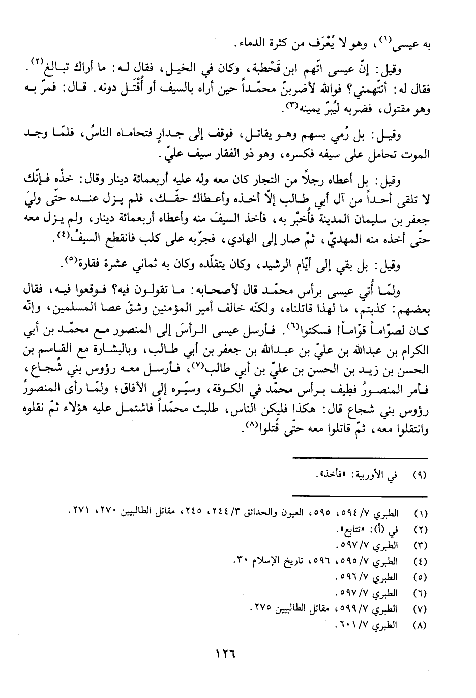 وَلَمَّا أُتِيَ عِيسَى بِرَأْسِ مُحَمَّدٍ قَالَ لِأَصْحَابِهِ: مَا تَقُولُونَ فِيهِ؟ فَوَقَعُوا فِيهِ، فَقَالَ بَعْضُهُمْ: كَذَبْتُمْ، مَا لِهَذَا قَاتَلْنَاهُ، وَلَكِنَّهُ خَالَفَ أَمِيرَ الْمُؤْمِنِينَ، وَشَقَّ عَصَا الْمُسْلِمِينَ، وَإِنْ كَانَ لَصَوَّامًا قَوَّامًا! فَسَكَتُوا. فَأَرْسَلَ عِيسَى الرَّأْسَ إِلَى الْمَنْصُورِ مَعَ مُحَمَّدِ بْنِ أَبِي الْكِرَامِ بْنِ عَبْدِ اللَّهِ بْنِ عَلِيِّ بْنِ عَبْدِ اللَّهِ بْنِ جَعْفَرِ بْنِ أَبِي طَالِبٍ، وَبِالْبِشَارَةِ مَعَ الْقَاسِمِ بْنِ الْحَسَنِ بْنِ زَيْدِ بْنِ الْحَسَنِ بْنِ عَلِيِّ بْنِ أَبِي طَالِبٍ، فَأَرْسَلَ مَعَهُ رُءُوسَ بَنِي شُجَاعٍ.