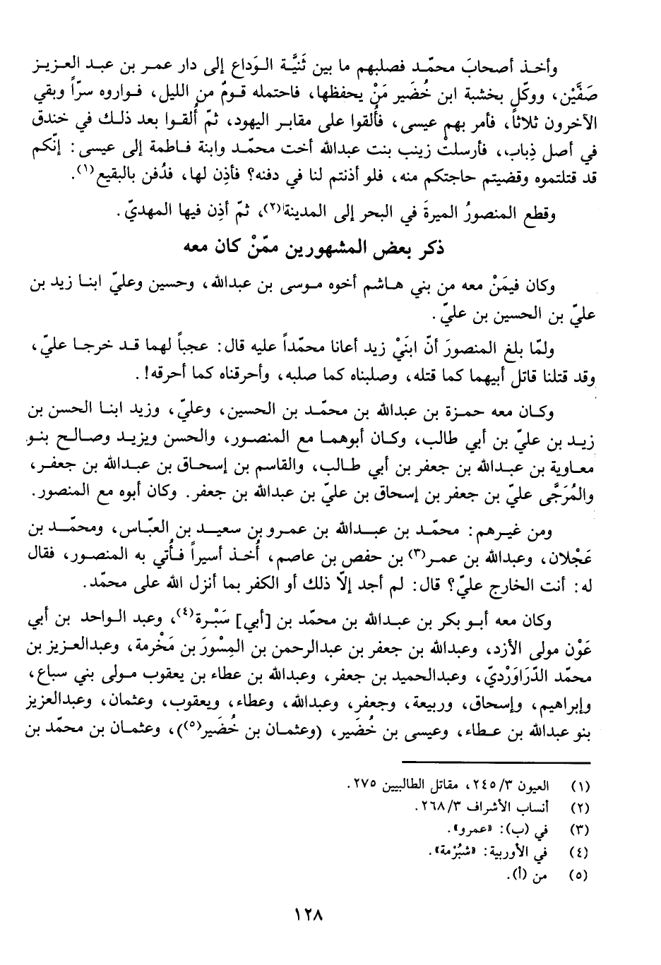 وَكَانَ مَعَهُ حَمْزَةُ بْنُ عَبْدِ اللَّهِ بْنِ مُحَمَّدِ بْنِ الْحُسَيْنِ، وَعَلِيٌّ وَزَيْدٌ ابْنَا الْحَسَنِ بْنِ زَيْدِ بْنِ عَلِيِّ بْنِ أَبِي طَالِبٍ، وَكَانَ أَبُوهُمَا مَعَ الْمَنْصُورِ، وَالْحَسَنُ وَيَزِيدُ وَصَالِحٌ بَنُو مُعَاوِيَةَ بْنِ عَبْدِ اللَّهِ بْنِ جَعْفَرِ بْنِ أَبِي طَالِبٍ، وَالْقَاسِمُ بْنُ إِسْحَاقَ بْنِ عَبْدِ اللَّهِ بْنِ جَعْفَرٍ، وَالْمُرَجَّى عَلِيُّ بْنُ جَعْفَرِ بْنِ إِسْحَاقَ بْنِ عَلِيِّ بْنِ عَبْدِ اللَّهِ بْنِ جَعْفَرٍ، وَكَانَ أَبُوهُ مَعَ الْمَنْصُورِ.