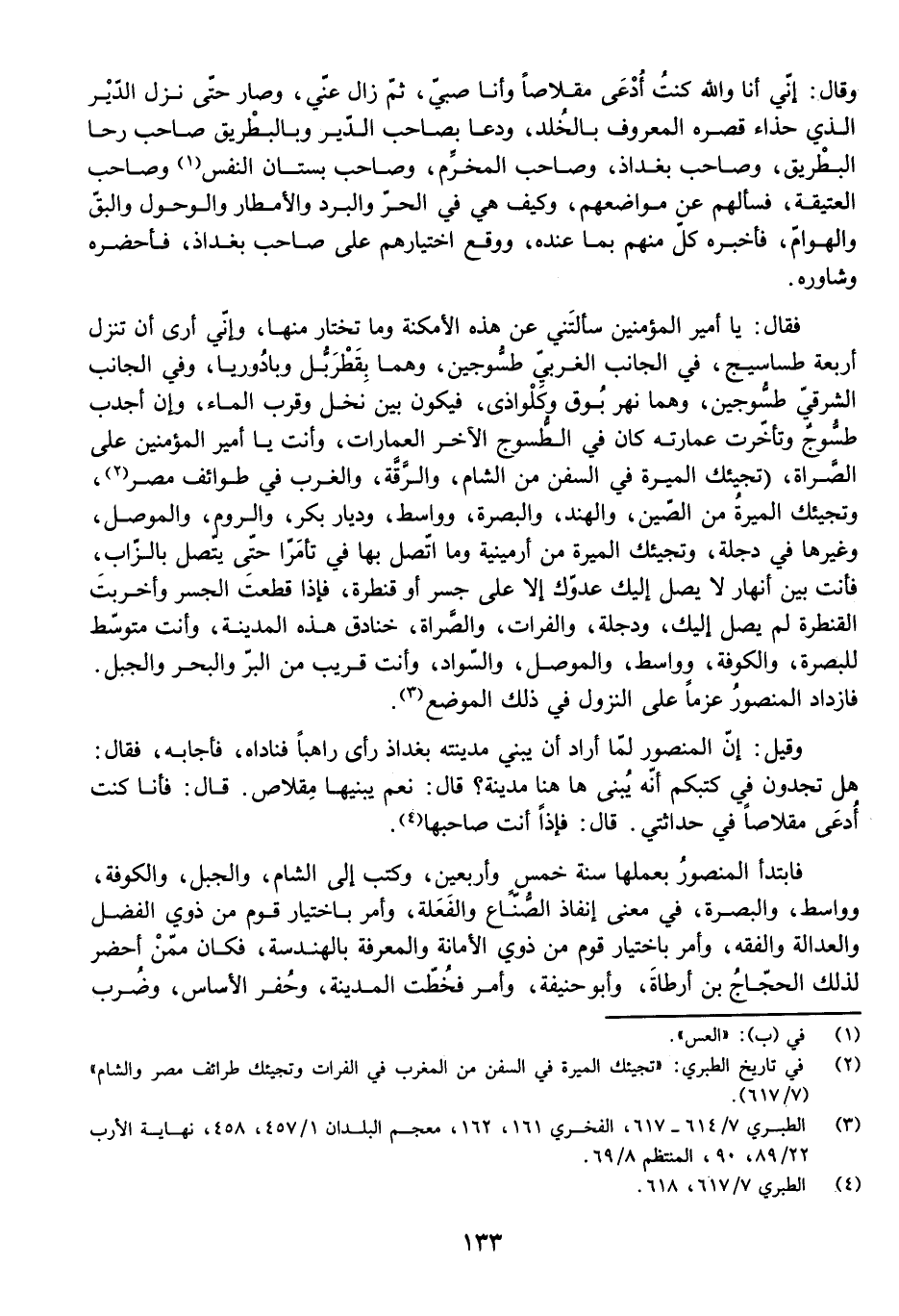 فَقَالَ: يَا أَمِيرَ الْمُؤْمِنِينَ سَأَلْتَنِي عَنْ هَذِهِ الْأَمْكِنَةِ وَمَا تَخْتَارُ مِنْهَا، وَإِنِّي أَرَى أَنْ تُنْزِلَ أَرْبَعَةَ طَسَاسِيجَ فِي الْجَانِبِ الْغَرْبِيِّ طَسُّوجَيْنِ، وَهُمَا بِقُطْرُبُّلَ وَبَادُورَيَا، وَفِي الْجَانِبِ الشَّرْقِيِّ طَسُّوجَيْنِ وَهُمَا نَهْرُ بُوقٍ وَكَلْوَاذَى، فَيَكُونَ بَيْنَ نَخْلٍ وَقُرْبَ الْمَاءِ، وَإِنْ أَجْدَبَ طَسُّوجٌ وَتَأَخَّرَتْ عِمَارَتُهُ كَانَ فِي الطَّسُّوجِ الْآخَرِ الْعِمَارَاتُ.