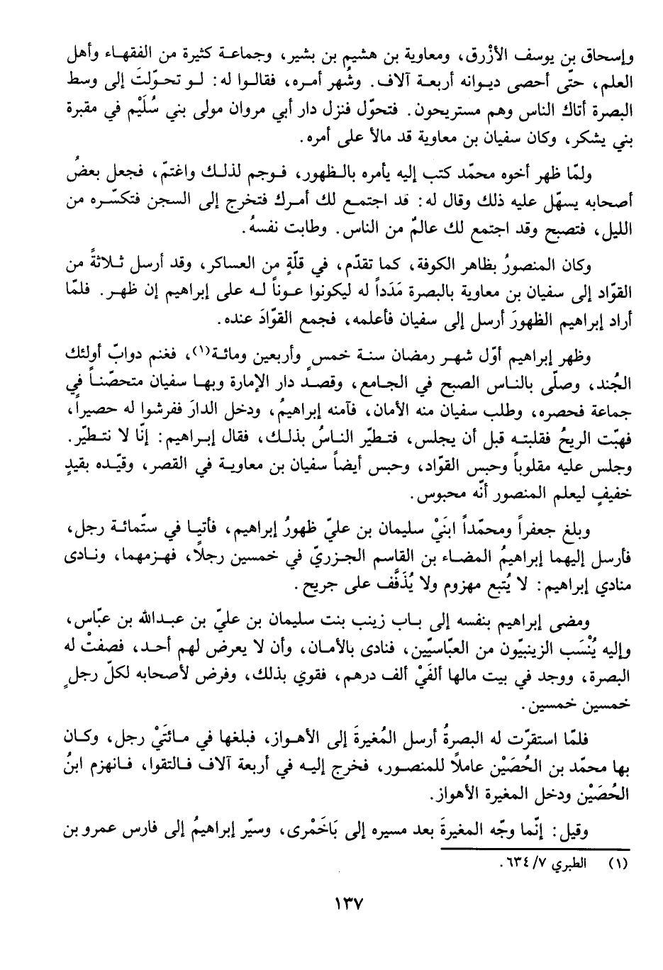 وَبَلَغَ جَعْفَرًا وَمُحَمَّدًا ابْنَيْ سُلَيْمَانَ بْنِ عَلِيٍّ ظُهُورُ إِبْرَاهِيمَ، فَأَتَيَا فِي سِتِّمِائَةِ رَجُلٍ، فَأَرْسَلَ إِلَيْهِمَا إِبْرَاهِيمُ الْمَضَاءَ بْنَ الْقَاسِمِ الْجَزَرِيَّ فِي خَمْسِينَ رَجُلًا، فَهَزَمَهُمَا، وَنَادَى مُنَادِي إِبْرَاهِيمَ: لَا يُتْبَعُ مَهْزُومٌ وَلَا يُذَفَّفُ عَلَى جَرِيحٍ.