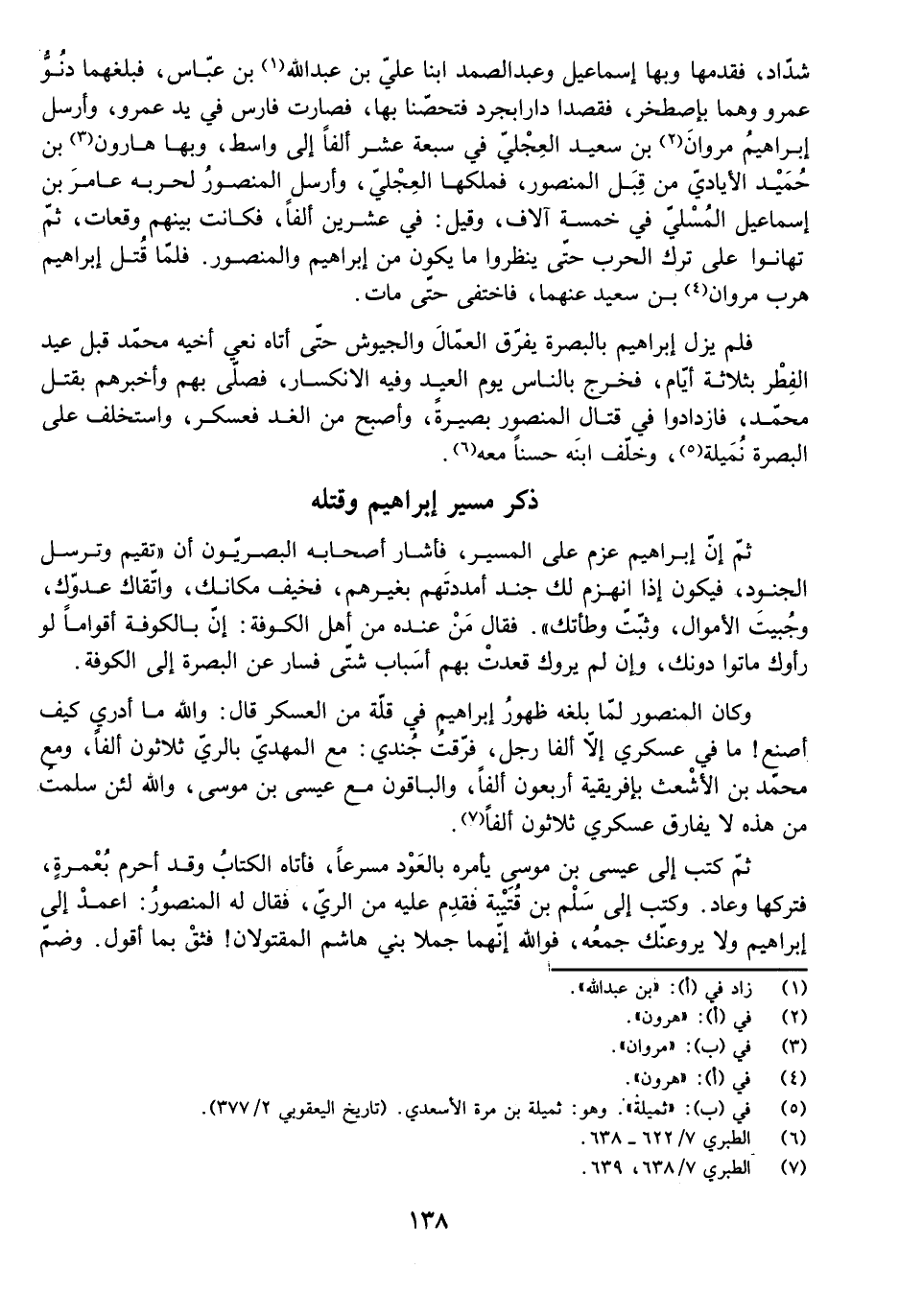 ثُمَّ كَتَبَ إِلَى عِيسَى بْنِ مُوسَى يَأْمُرُهُ بِالْعَوْدِ مُسْرِعًا، فَأَتَاهُ الْكِتَابُ وَقَدْ أَحْرَمَ بِعُمْرَةٍ، فَتَرَكَهَا وَعَادَ. وَكَتَبَ إِلَى سَلْمِ بْنِ قُتَيْبَةَ فَقَدِمَ عَلَيْهِ مِنَ الرَّيِّ، فَقَالَ لَهُ الْمَنْصُورُ: اعْمِدْ إِلَى إِبْرَاهِيمَ وَلَا يَرُوعَنَّكَ جَمْعُهُ، فَوَاللَّهِ إِنَّهُمَا جَمَلَا بَنِي هَاشِمٍ الْمَقْتُولَانِ! فَثِقْ بِمَا أَقُولُ.