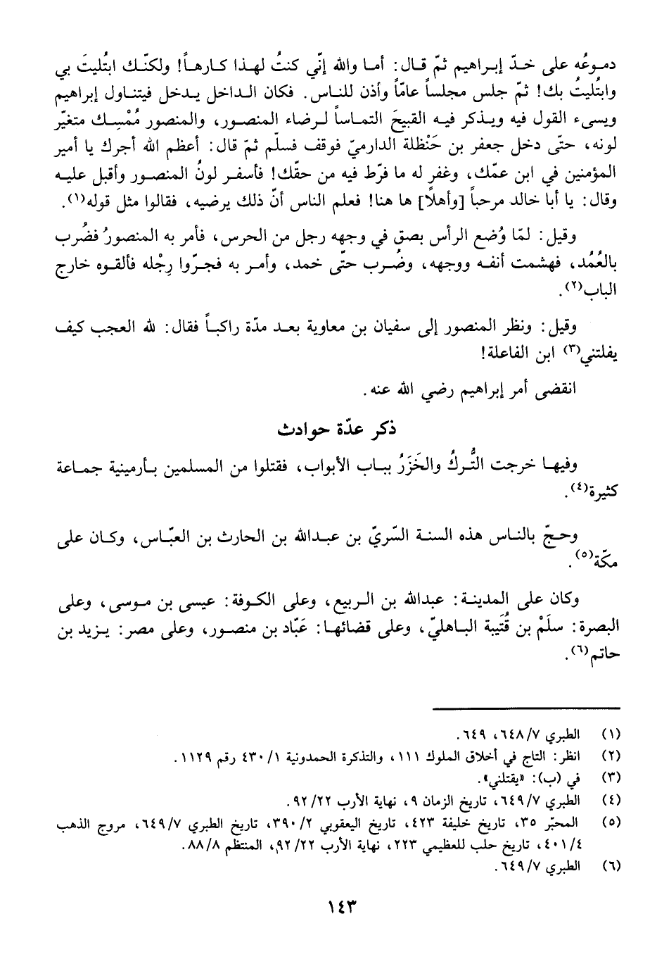 ثُمَّ جَلَسَ مَجْلِسًا عَامًّا وَأَذِنَ لِلنَّاسِ. فَكَانَ الدَّاخِلُ يَدْخُلُ فَيَتَنَاوَلُ إِبْرَاهِيمَ وَيُسِيءُ الْقَوْلَ فِيهِ، وَيَذْكُرُ فِيهِ الْقَبِيحَ الْتِمَاسًا لِرِضَاءِ الْمَنْصُورِ، وَالْمَنْصُورُ مُمْسِكٌ مُتَغَيِّرٌ لَوْنُهُ.